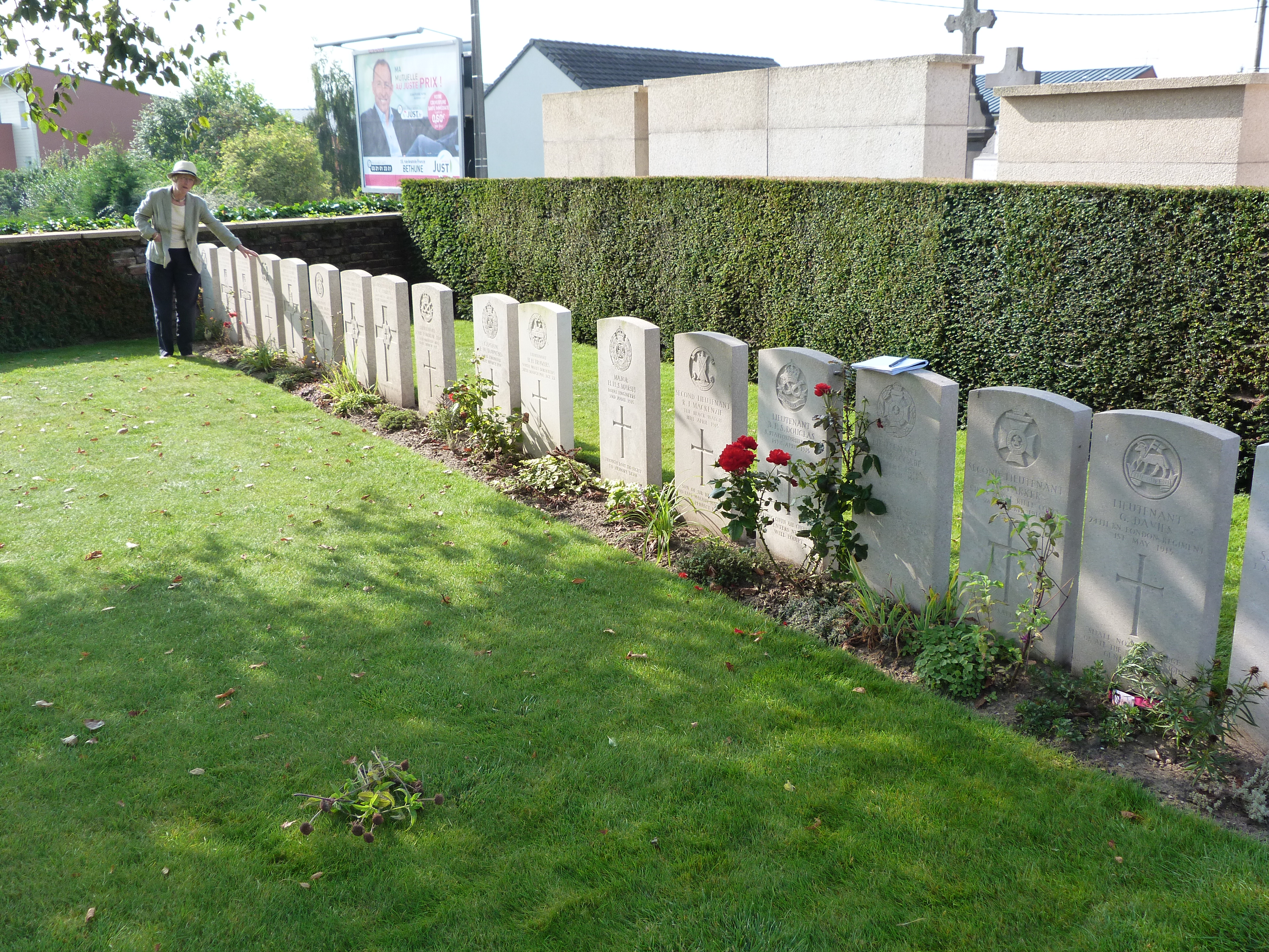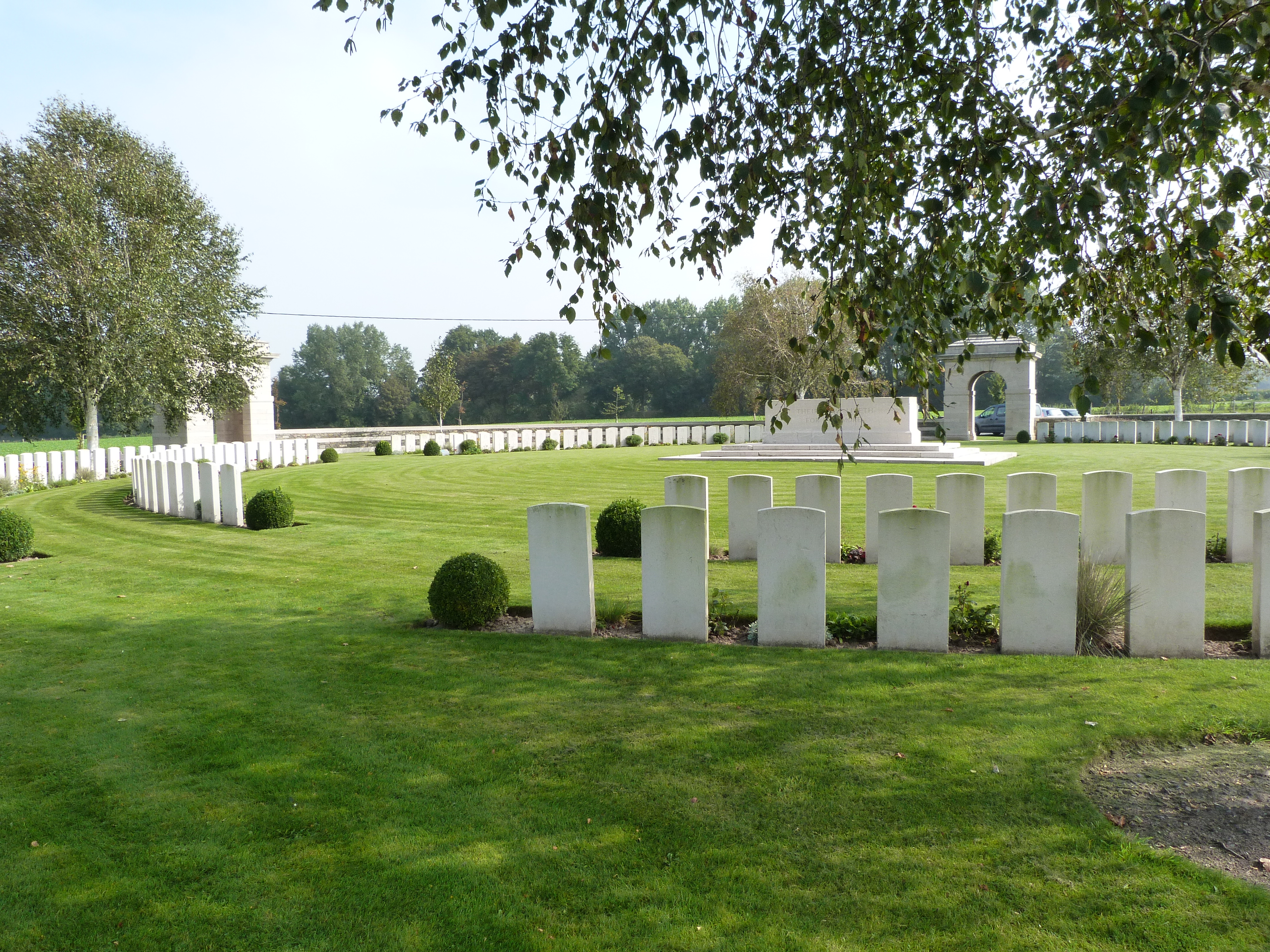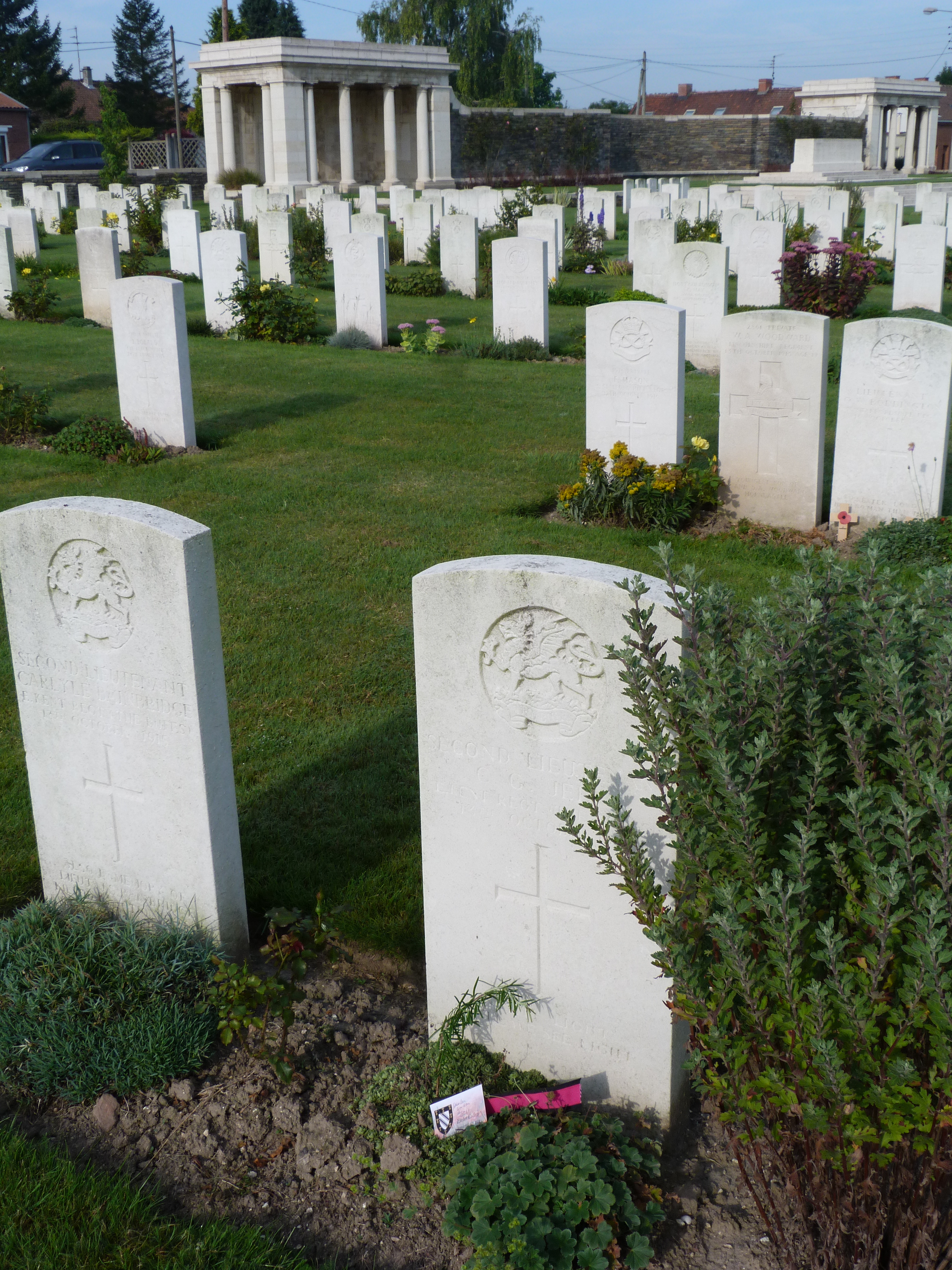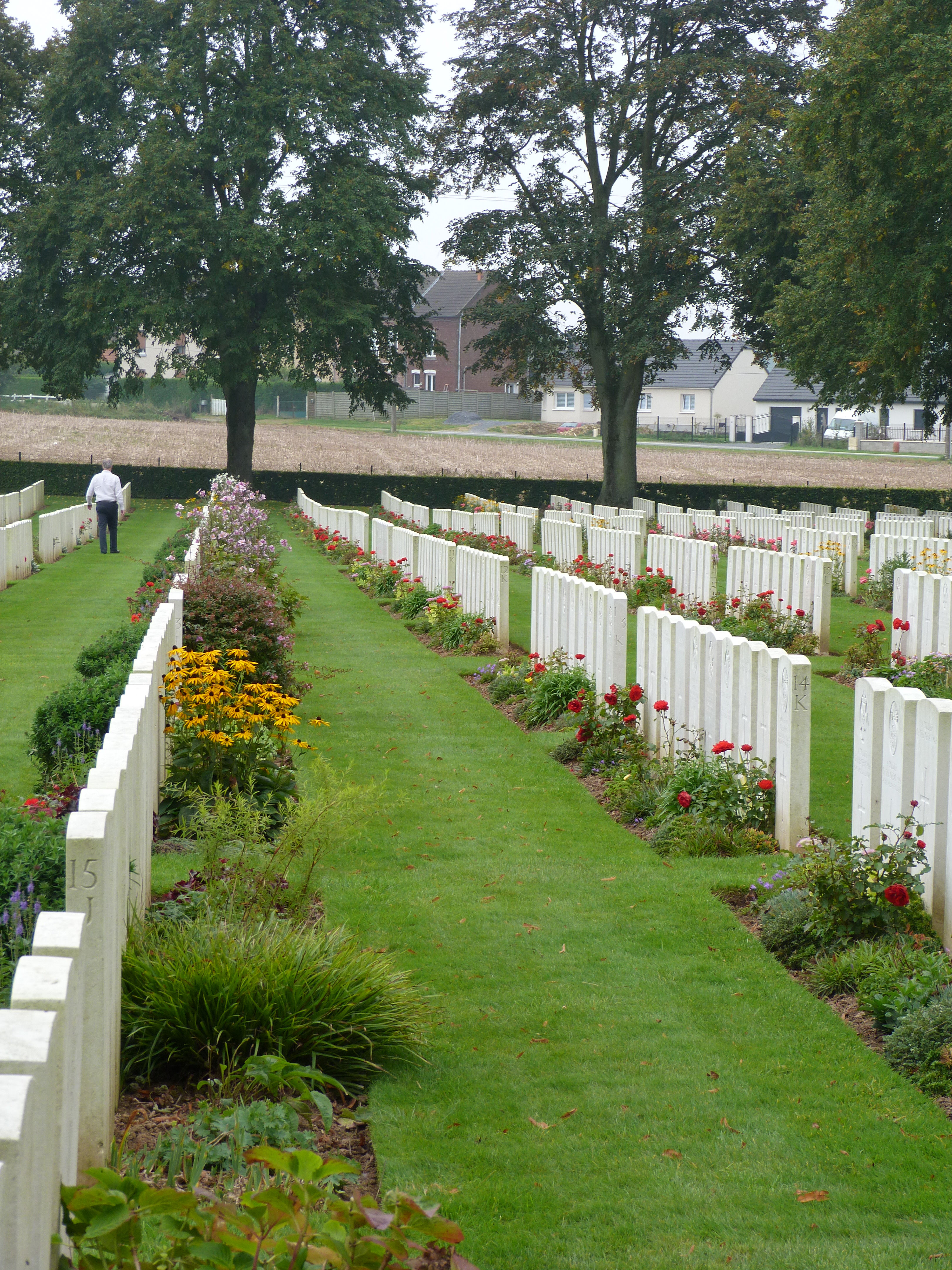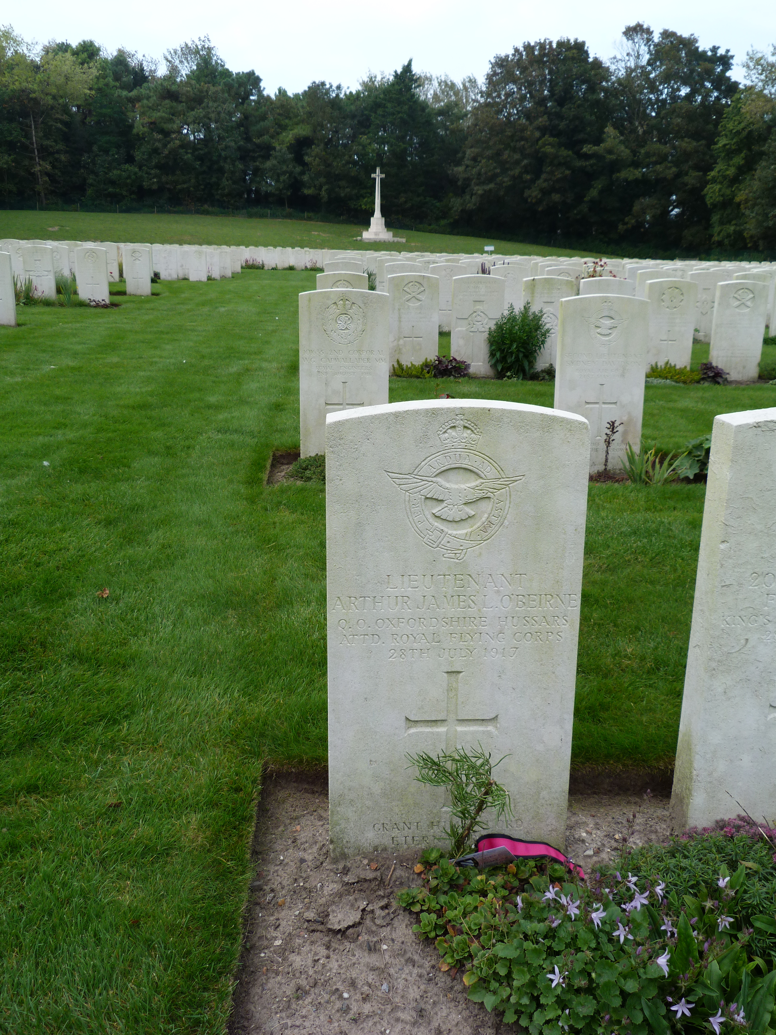 This medium sized cemetery is located at the foot of the hill; the Cross of Sacrifice is on raised ground, and the overall atmosphere is again one of peace and calm. We came to honour Arthur O’Beirne, who matriculated in 1907, and who joined up in August 1914. He transferred from the Queen’s Own Oxfordshire Hussars to the newly created Royal Flying Corps, and died, aged 29 of wounds received in air fighting on 28 July 1917. The words on his tomb are perhaps a good way to end this account: as he rests not only in a Christian understanding, but also in the peace of an inestimably well cared for cemetery, such as we found throughout our visit.