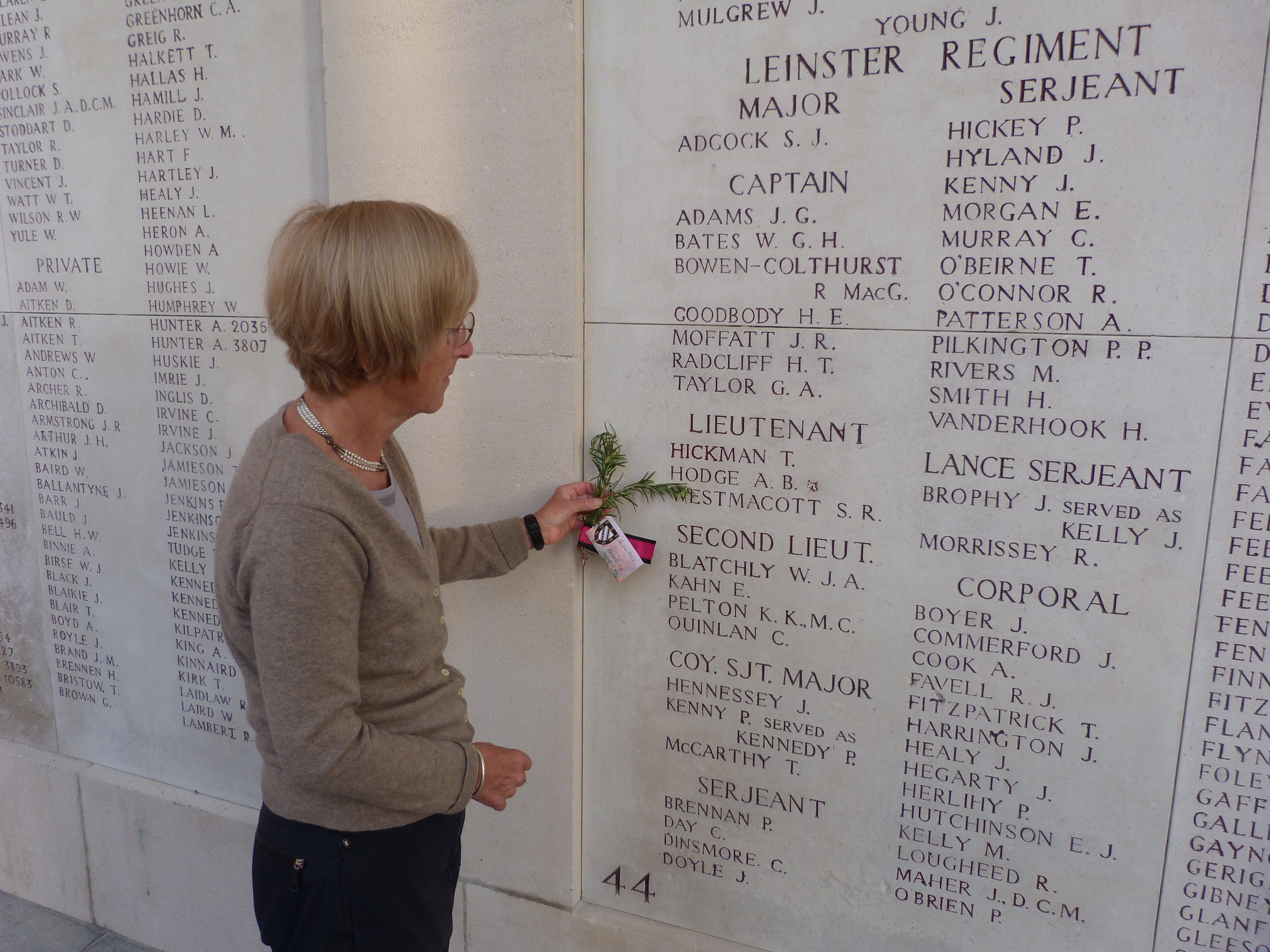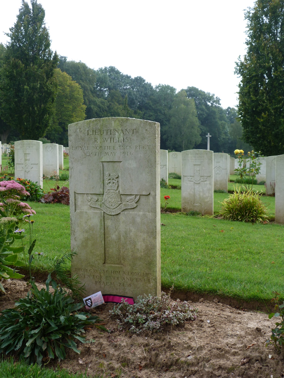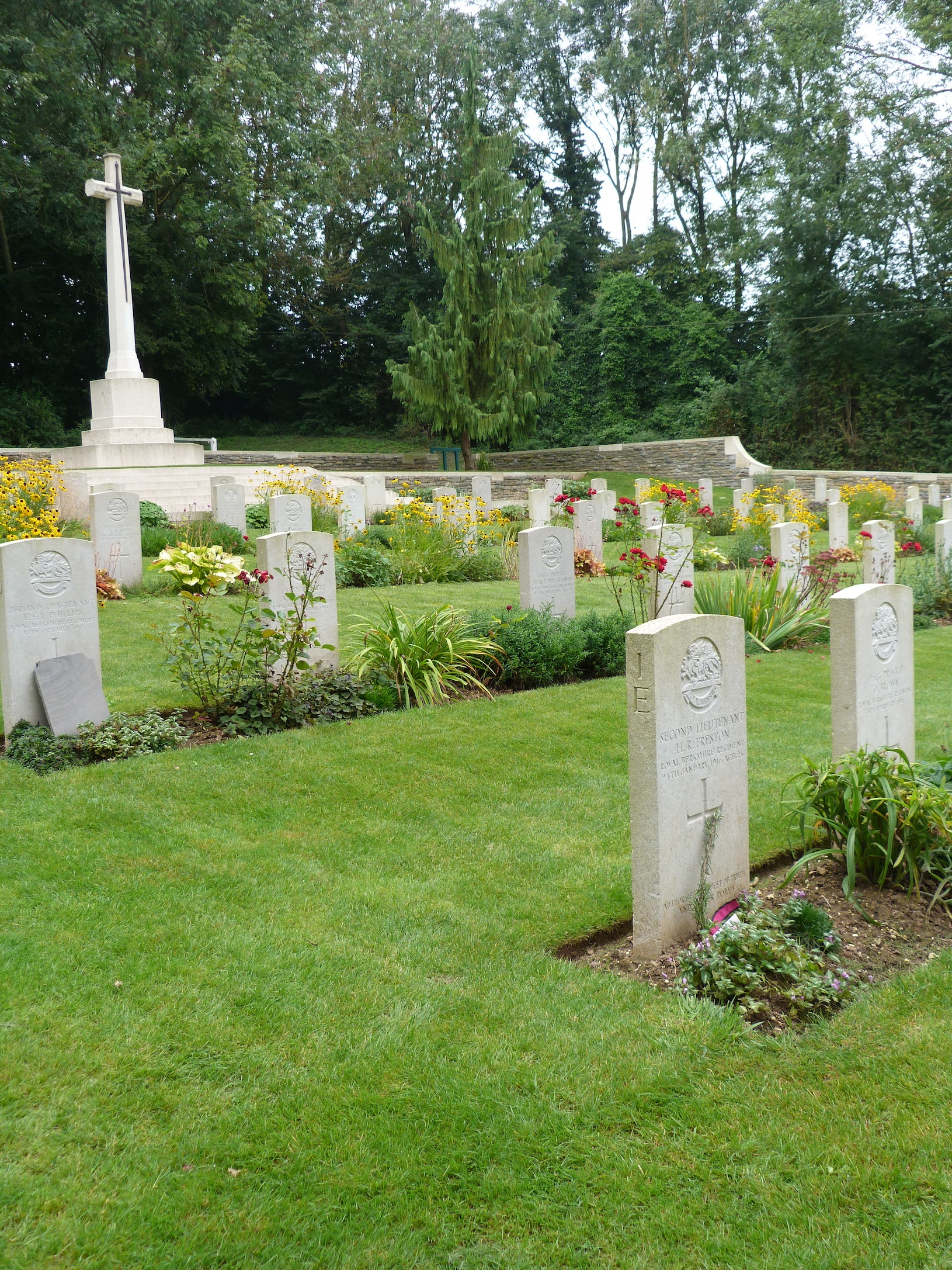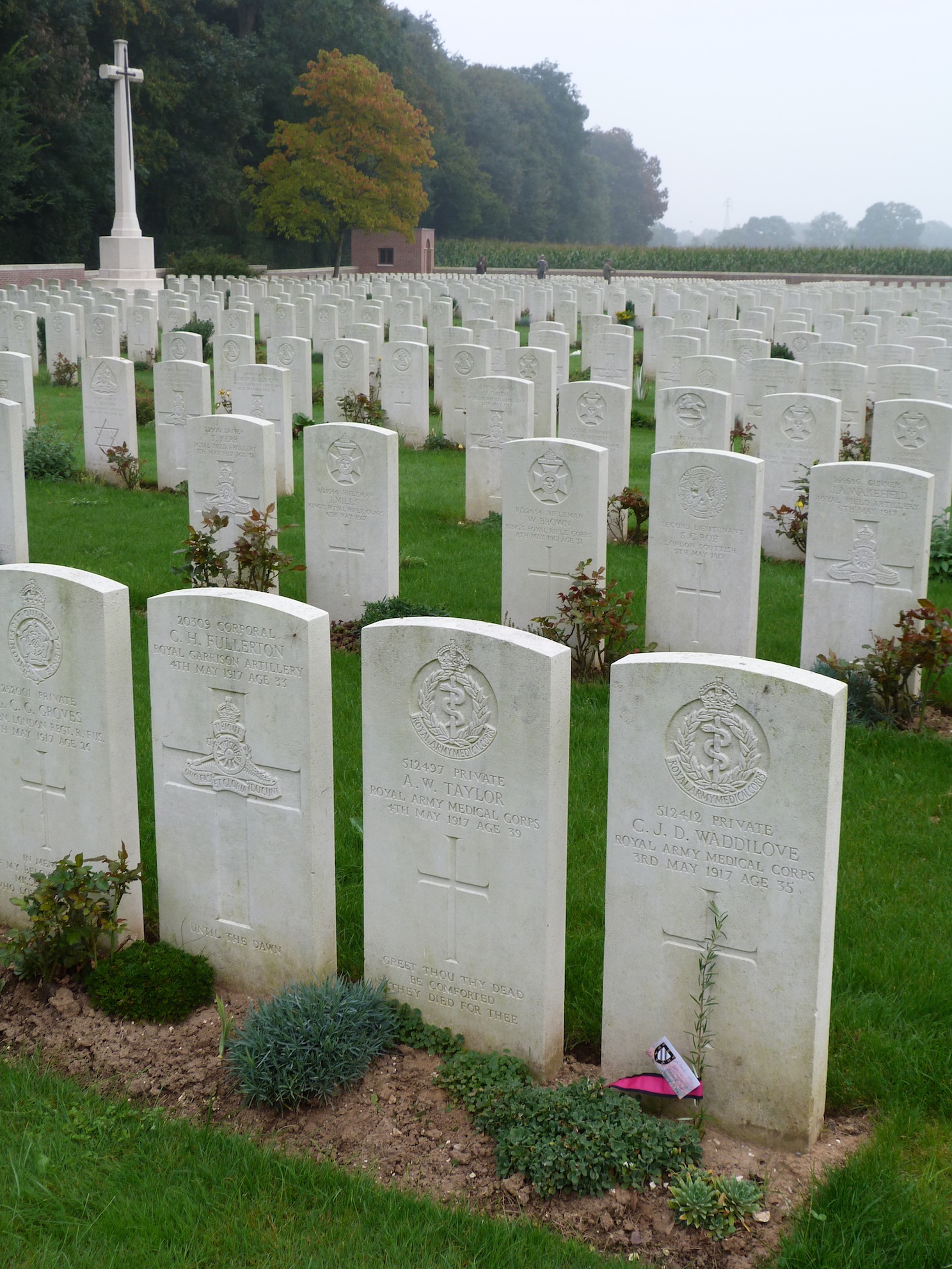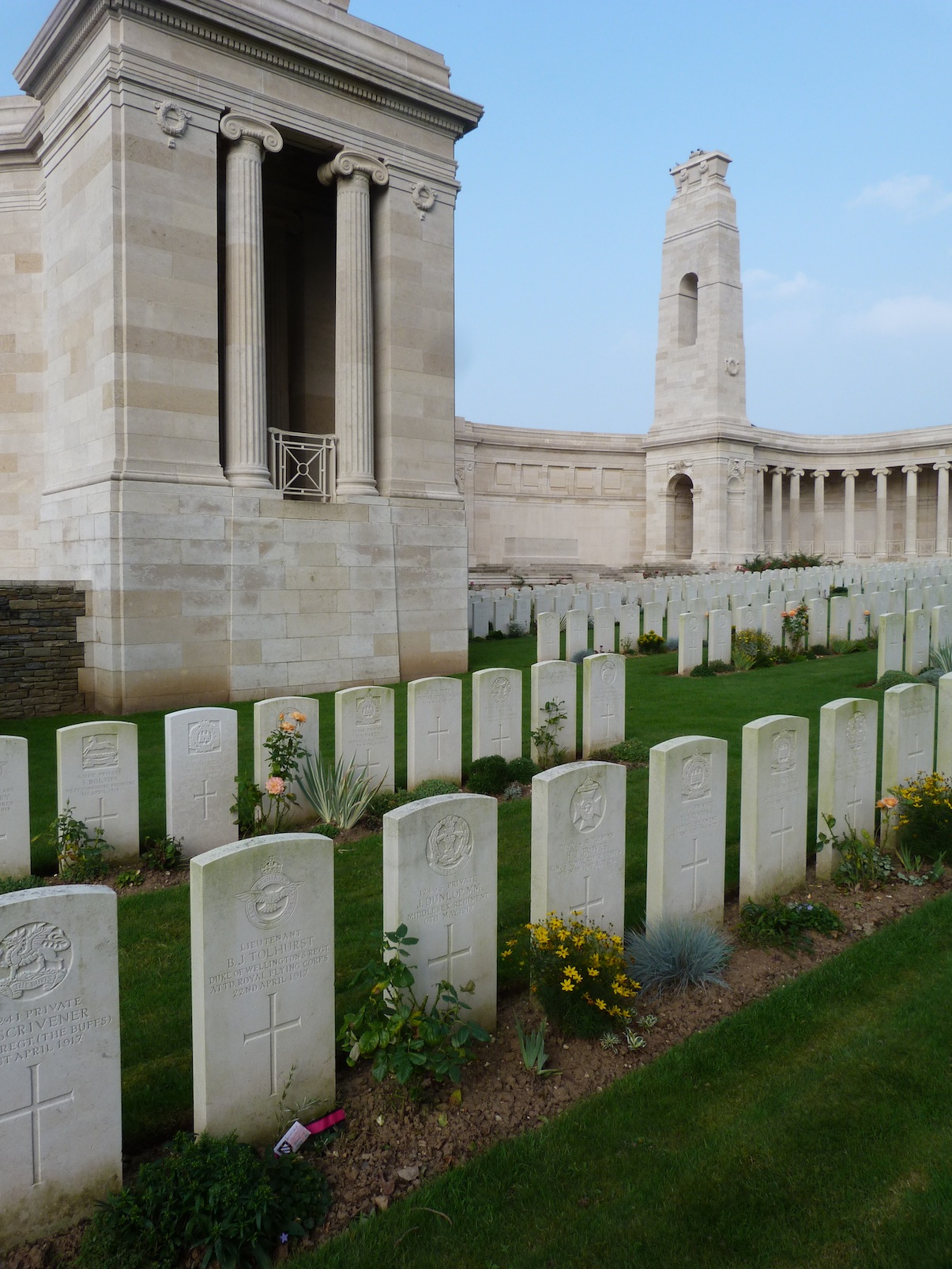 This medium sized cemetery is located at the foot of the hill; the Cross of Sacrifice is on raised ground, and the overall atmosphere is again one of peace and calm. We came to honour Arthur O’Beirne, who matriculated in 1907, and who joined up in August 1914. He transferred from the Queen’s Own Oxfordshire Hussars to the newly created Royal Flying Corps, and died, aged 29 of wounds received in air fighting on 28 July 1917. The words on his tomb are perhaps a good way to end this account: as he rests not only in a Christian understanding, but also in the peace of an inestimably well cared for cemetery, such as we found throughout our visit.