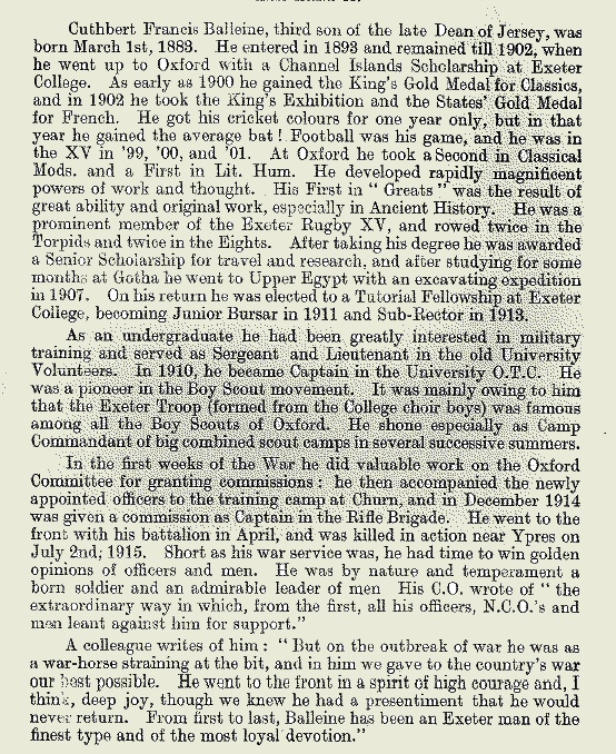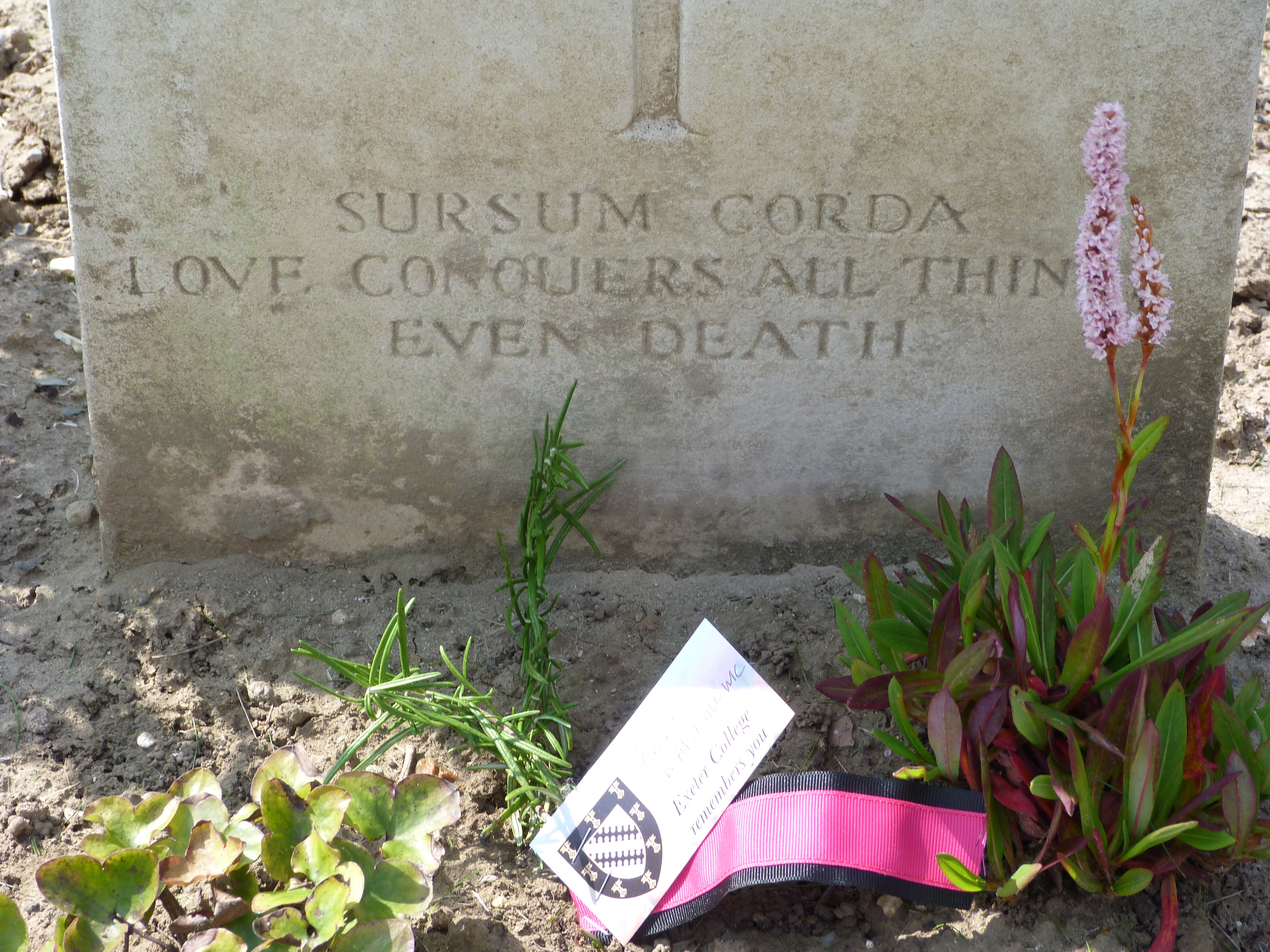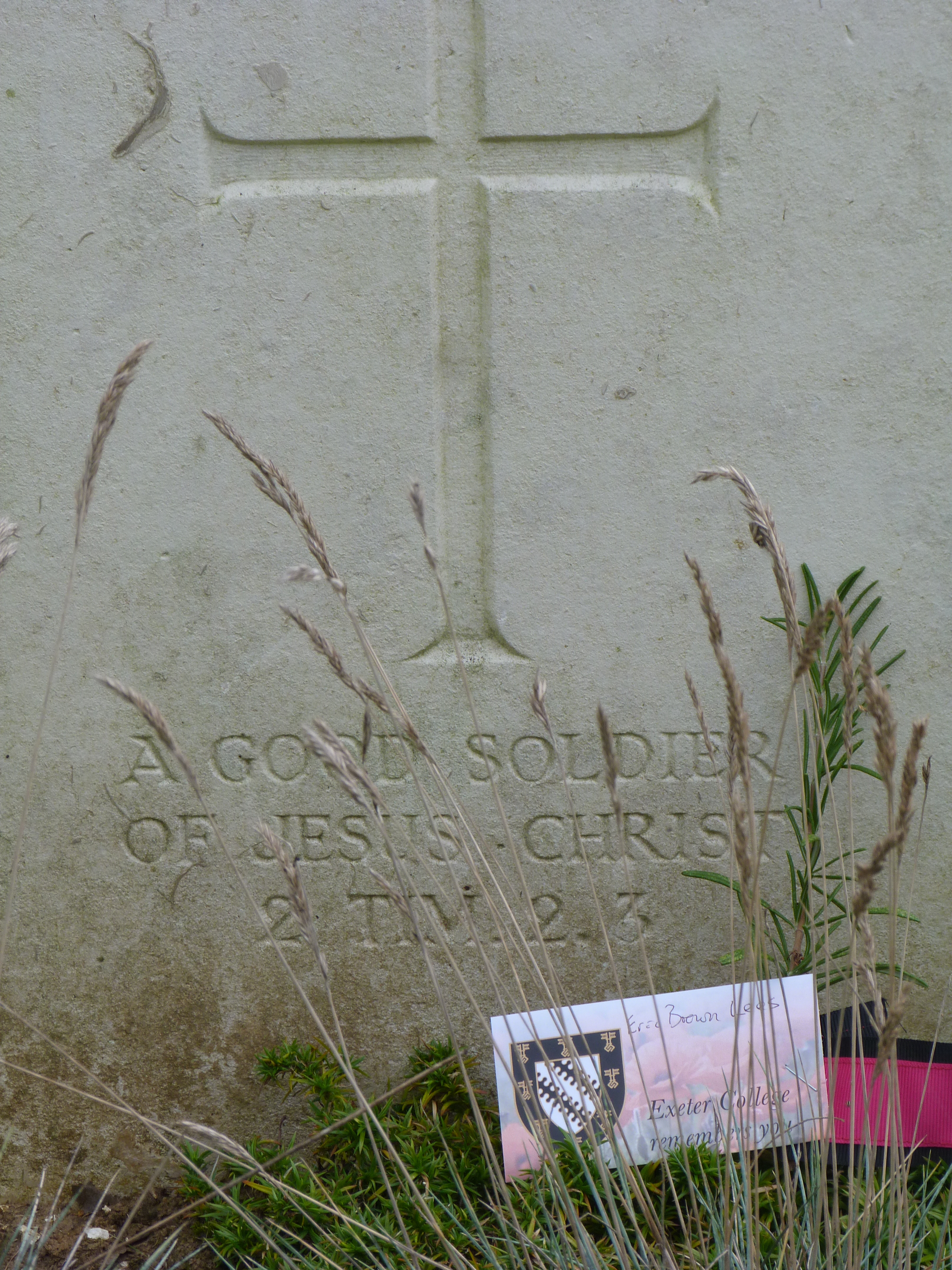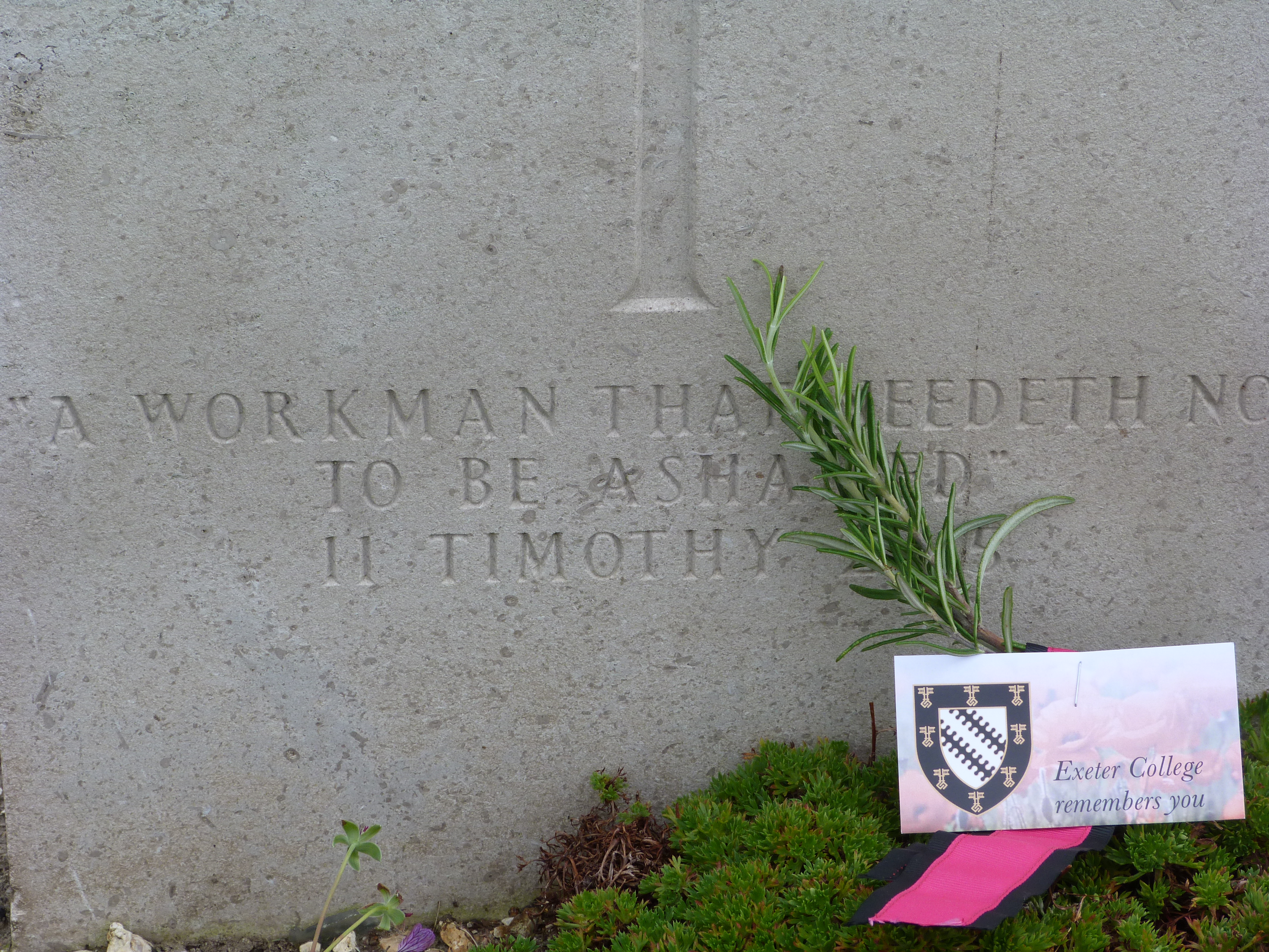 Bedford House was the name given to a chateau by the British soliders when they were beaten by the Flemish names with their tendency to have several js together. Here in a vast cemetery, with 2,500 unknown graves, lives Cuthbert Francis Balleine, who was a Fellow and Sub-Rector of the College. He came up to Exeter in 1902 and stayed on to be elected to a Fellowship. He was popular with students, and a great outdoor fan, which including forming the first Oxford University Scout Group made up of the trebles from the Choir. His obit portrays him in with an intimacy that makes this Fellow respect his contributions to College and to humanity. [Note that the wall behind his grave is currently being rebuilt]