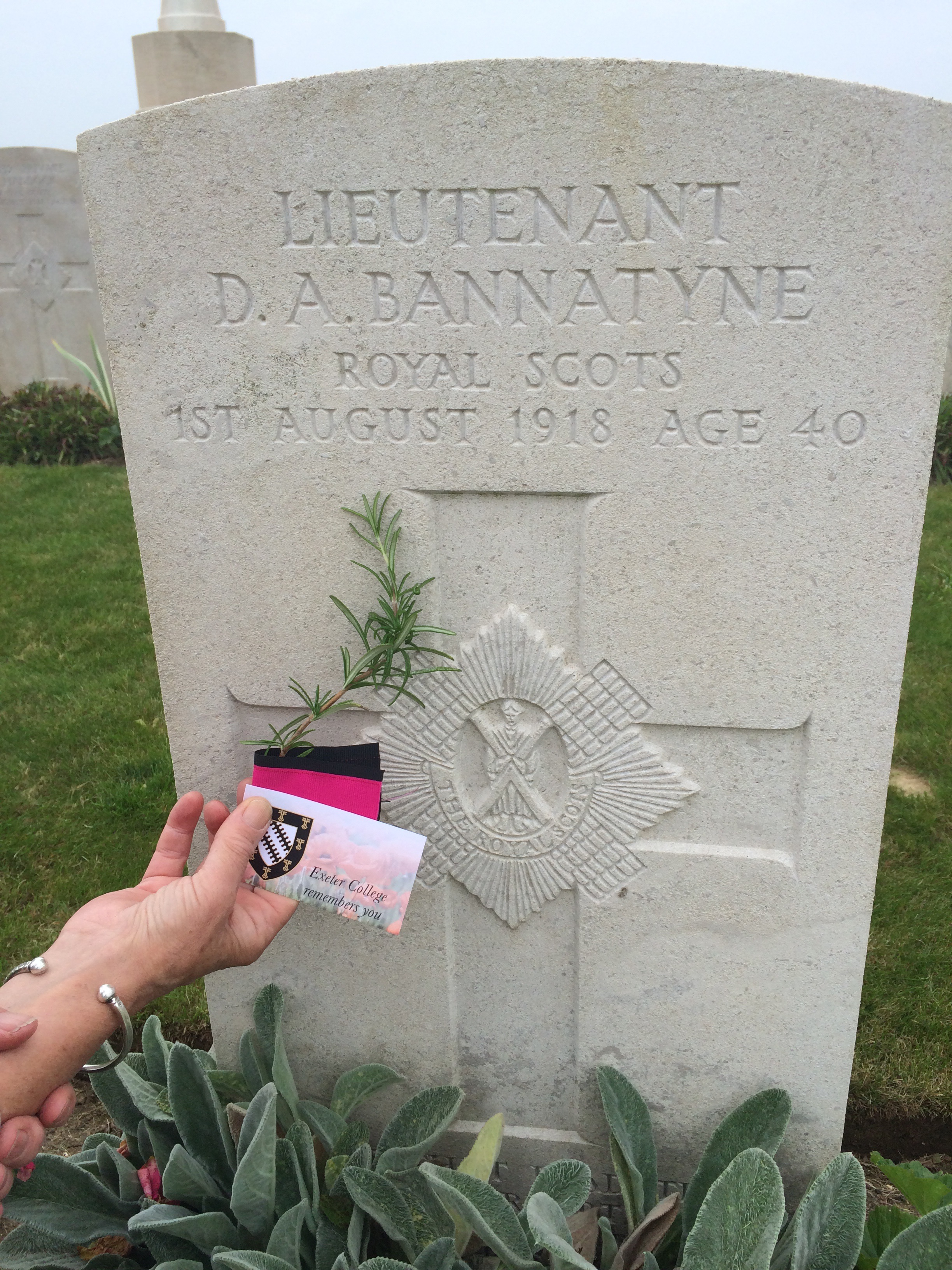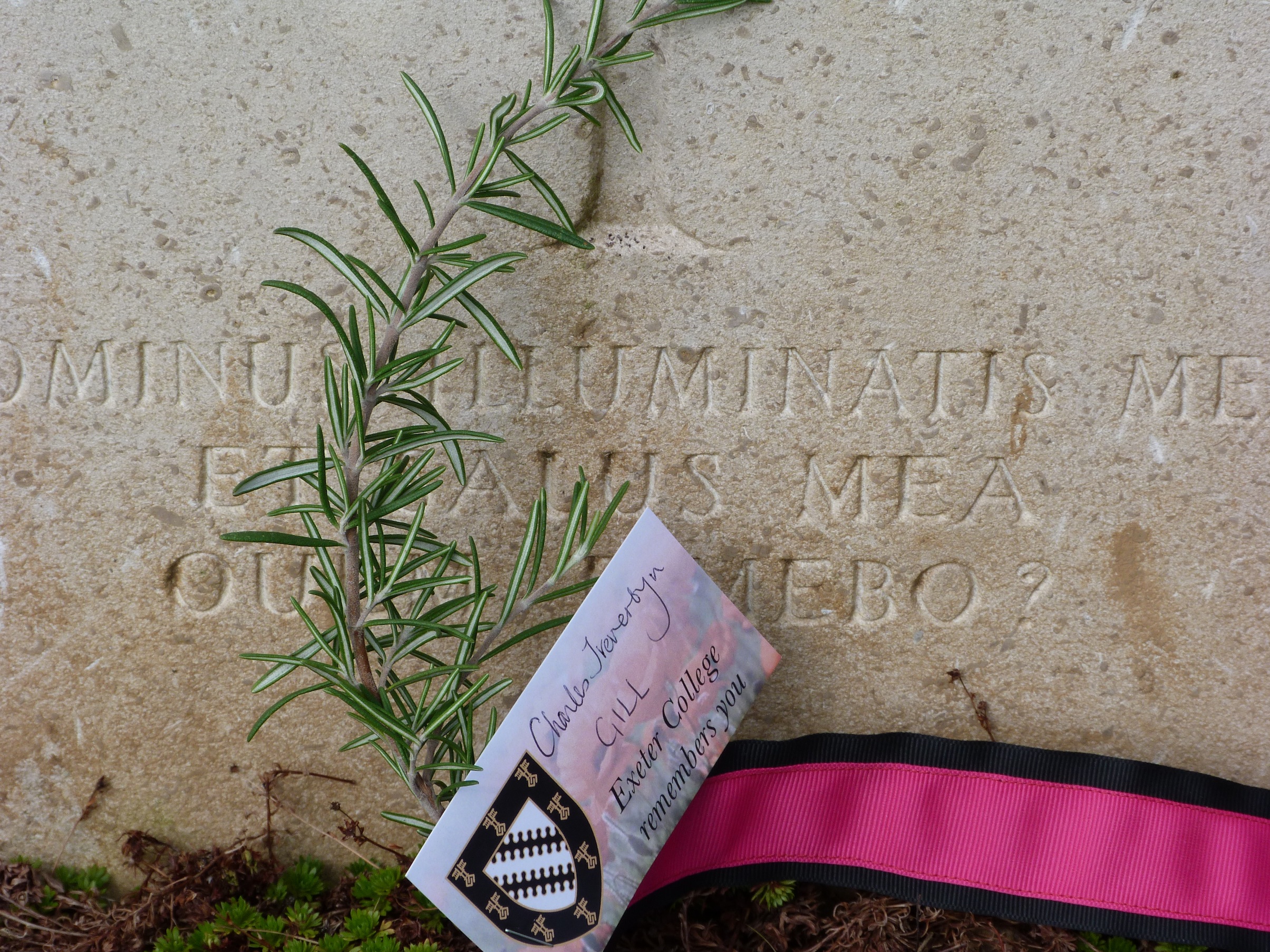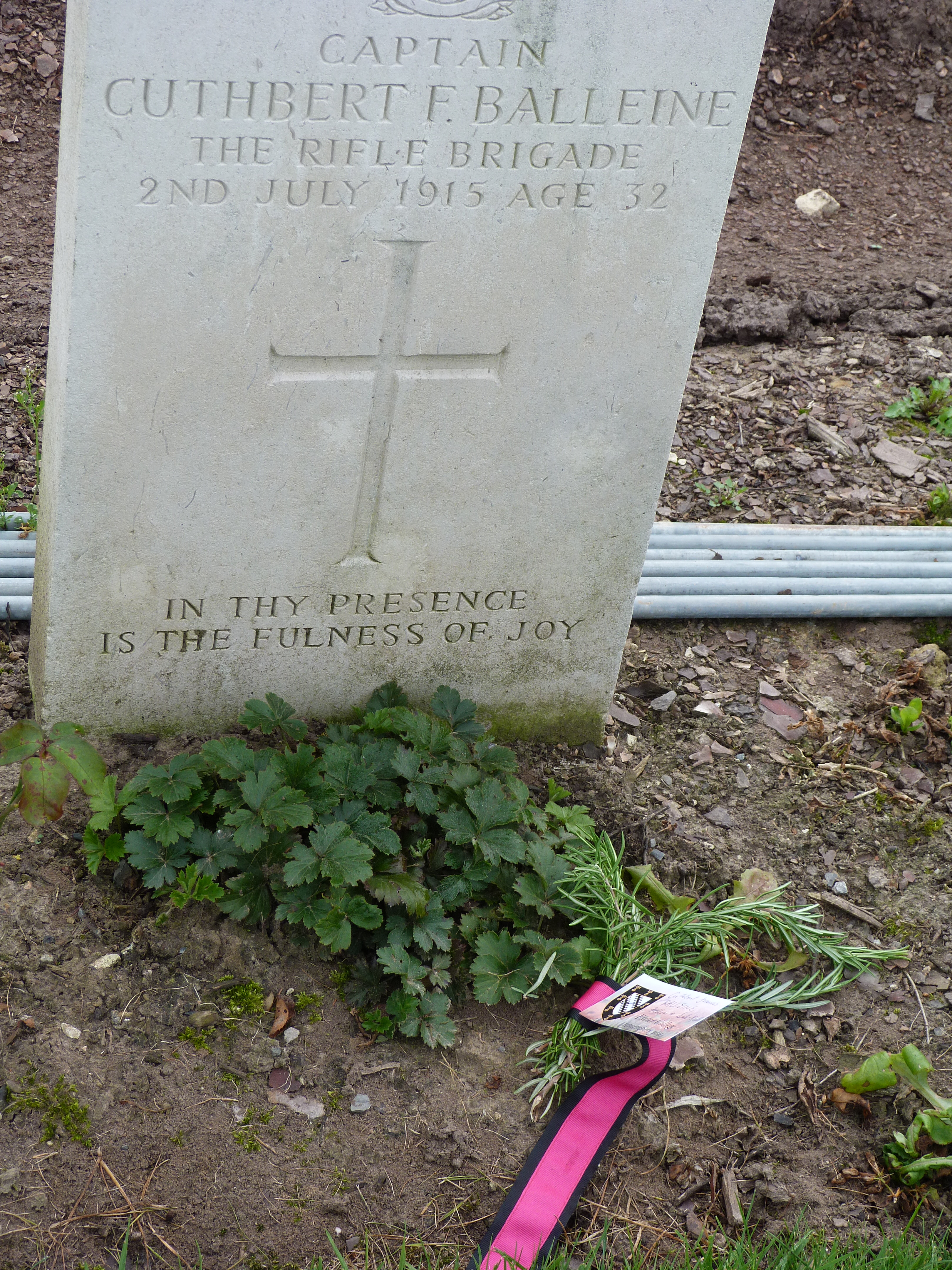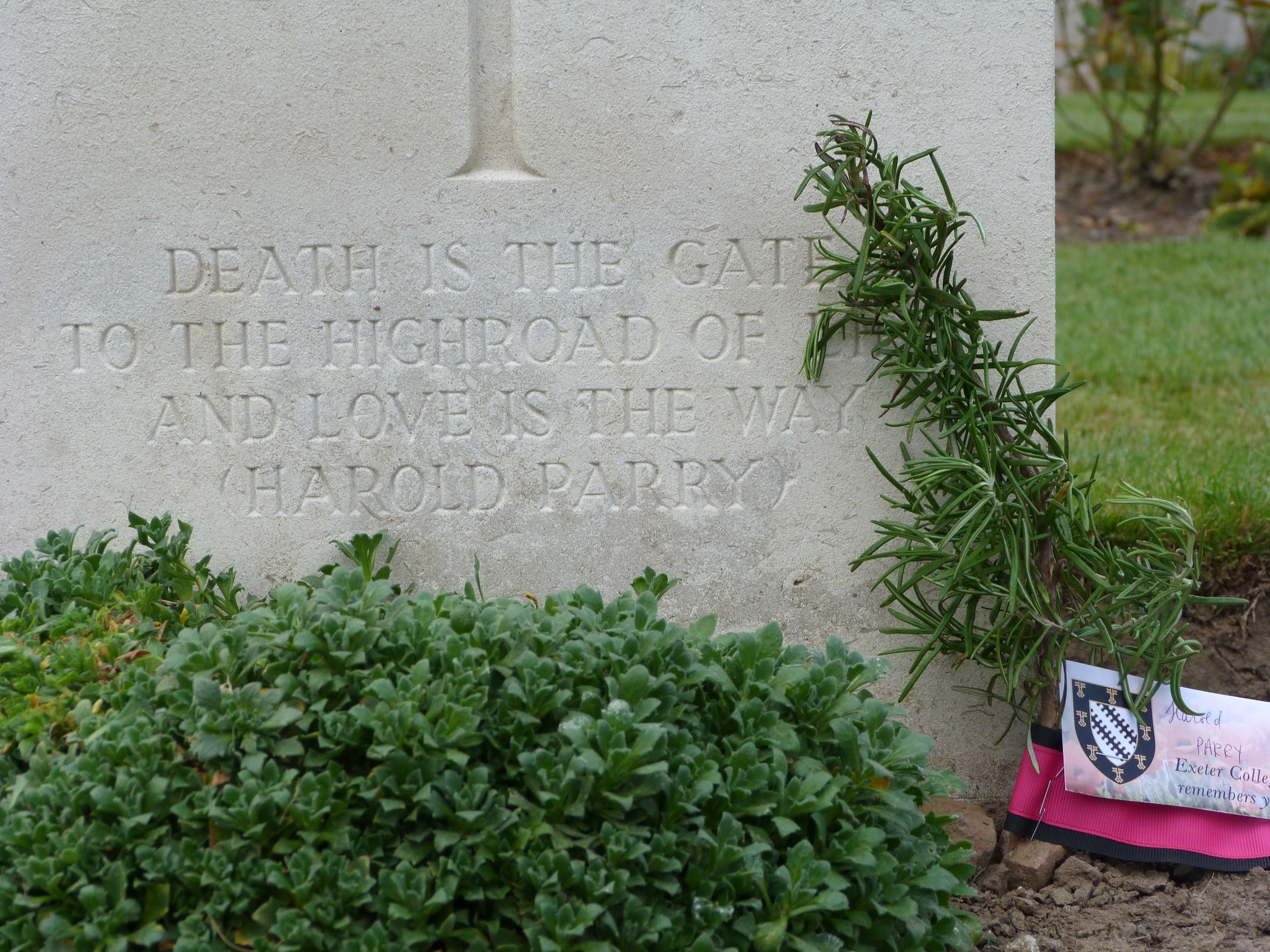 Bedford House was the name given to a chateau by the British soliders when they were beaten by the Flemish names with their tendency to have several js together. Here in a vast cemetery, with 2,500 unknown graves, lives Cuthbert Francis Balleine, who was a Fellow and Sub-Rector of the College. He came up to Exeter in 1902 and stayed on to be elected to a Fellowship. He was popular with students, and a great outdoor fan, which including forming the first Oxford University Scout Group made up of the trebles from the Choir. His obit portrays him in with an intimacy that makes this Fellow respect his contributions to College and to humanity. [Note that the wall behind his grave is currently being rebuilt]