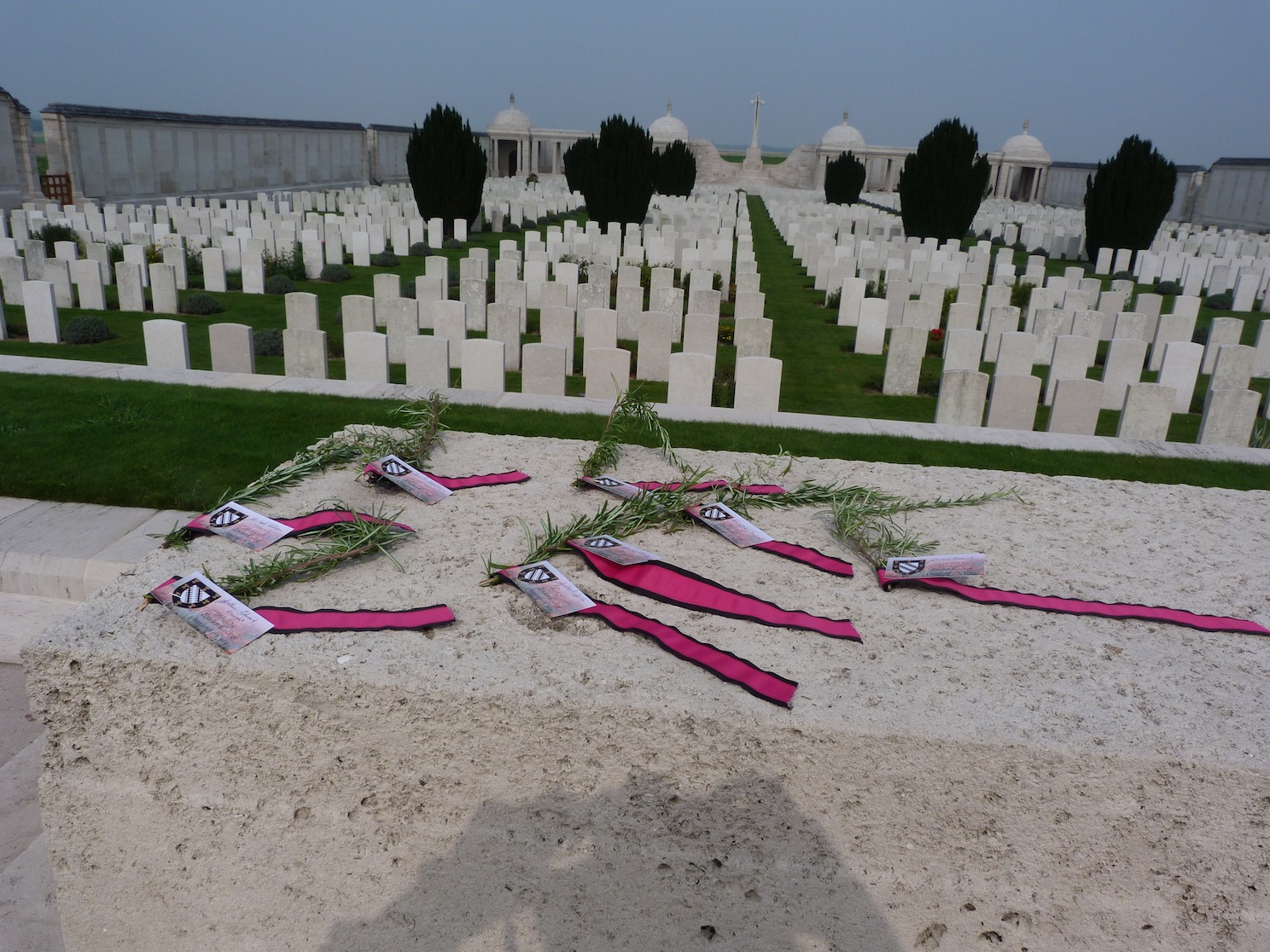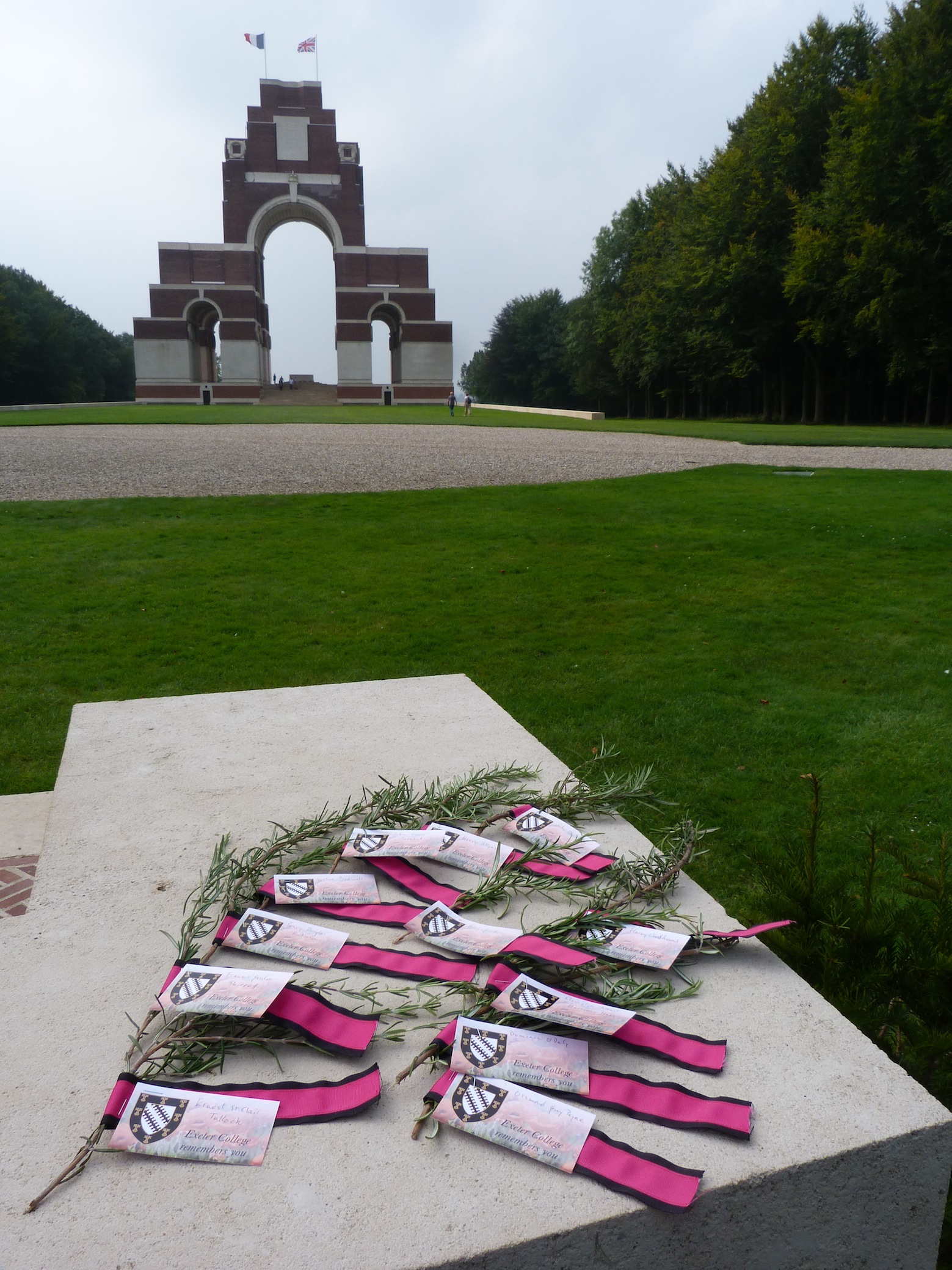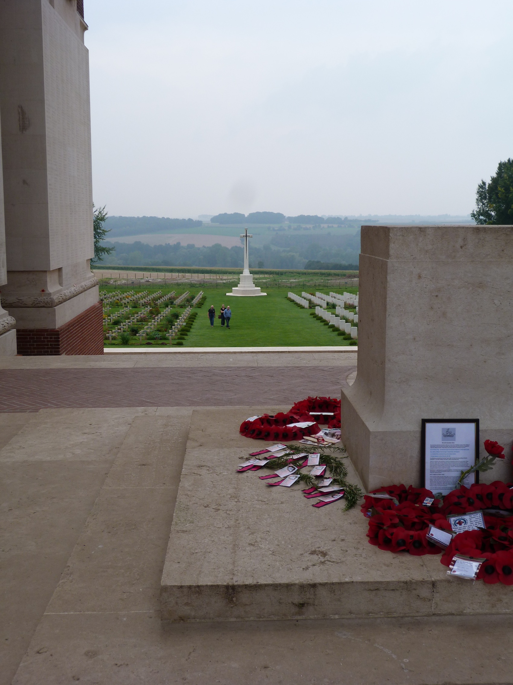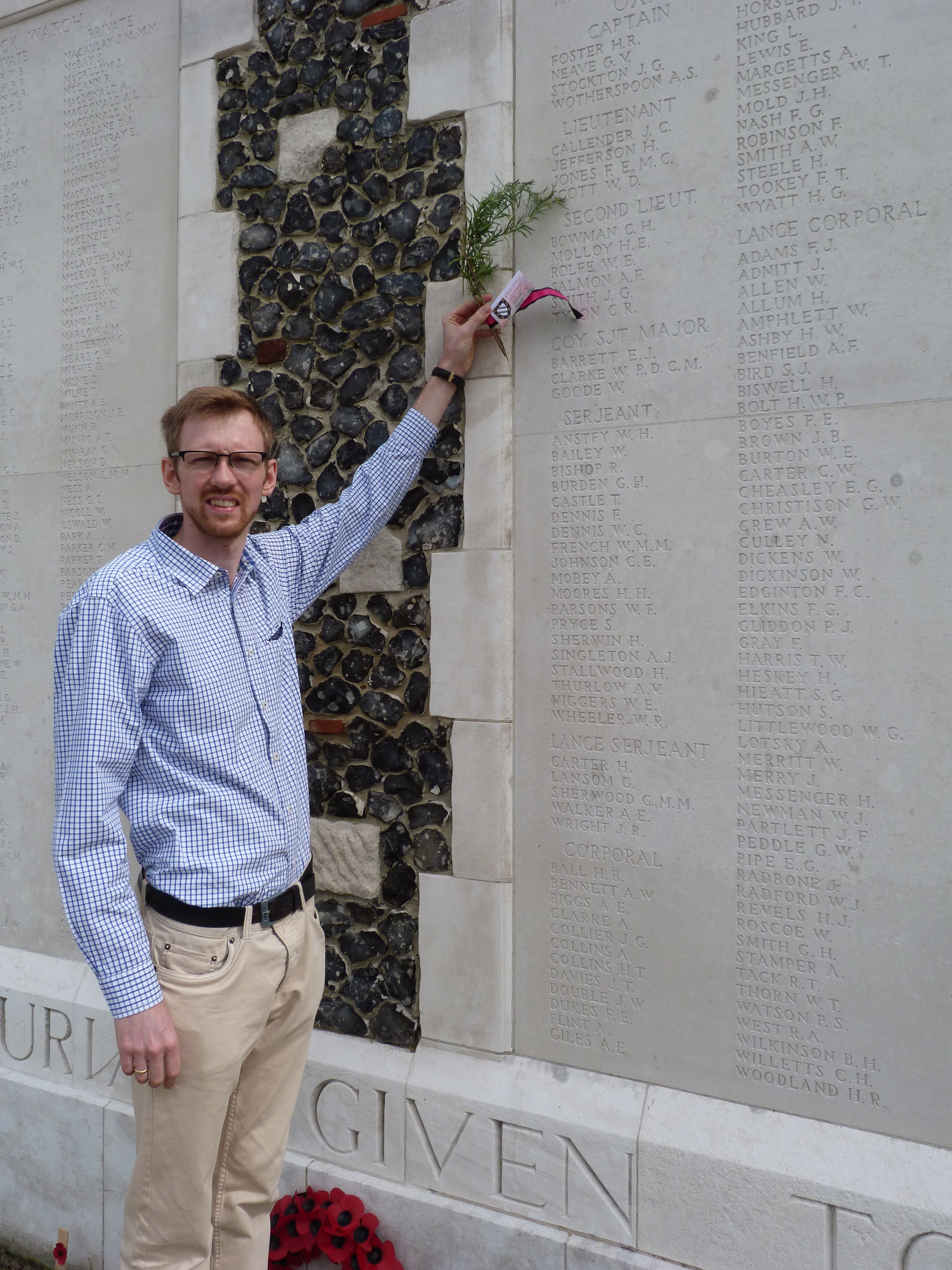 For the last two visits of today we were joined by Exonian David Delameillieure [2003 Biochemistry], who now is a Protestant Pastor in Belgium. With him we paid our respects to three Exonians at Tyne Cot. This memorial was built after it was discovered the Menin Gate was too small; it combines both graves and memorial panels, and takes its name from a pill box used as a dressing station: the original Tyne Cot [Cottage] is encased in the Cross of Sacrifice, at the suggestion of King George V. This site was by far the busiest of all memorials; there were several coaches parked in the car-park, and most of the visitors were English or English speaking. Writing back in Oxford, where we have memorials but very few graves, is it possible to say that part of the reason why so many British, Canadian, Australian people visit the war graves is because their narrative is part of our identity as nations, and as peoples, yet it is removed, not only by time, but by distance. Talking to David, who has lived in Belgium for many years, and thinking of the teenagers snogging at the Menin Gate, the war and its consequences are all around: you can’t drive for more than 5 minutes without finding at least two Commonwealth, one French and a German cemetery. There is probably less need for more official, or pronounced commemorations in Belgium because it has entered the subconscious. Even if people make annual pilgrimages to these graves, that is very different from seeing them on the way to the supermarket or restaurant.