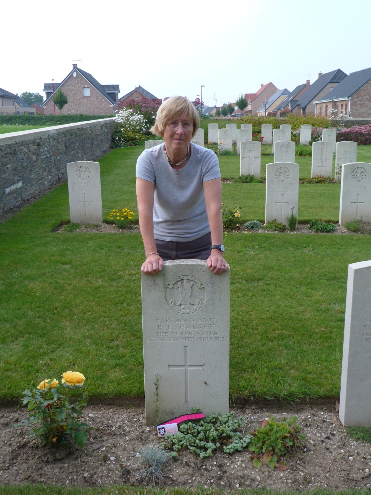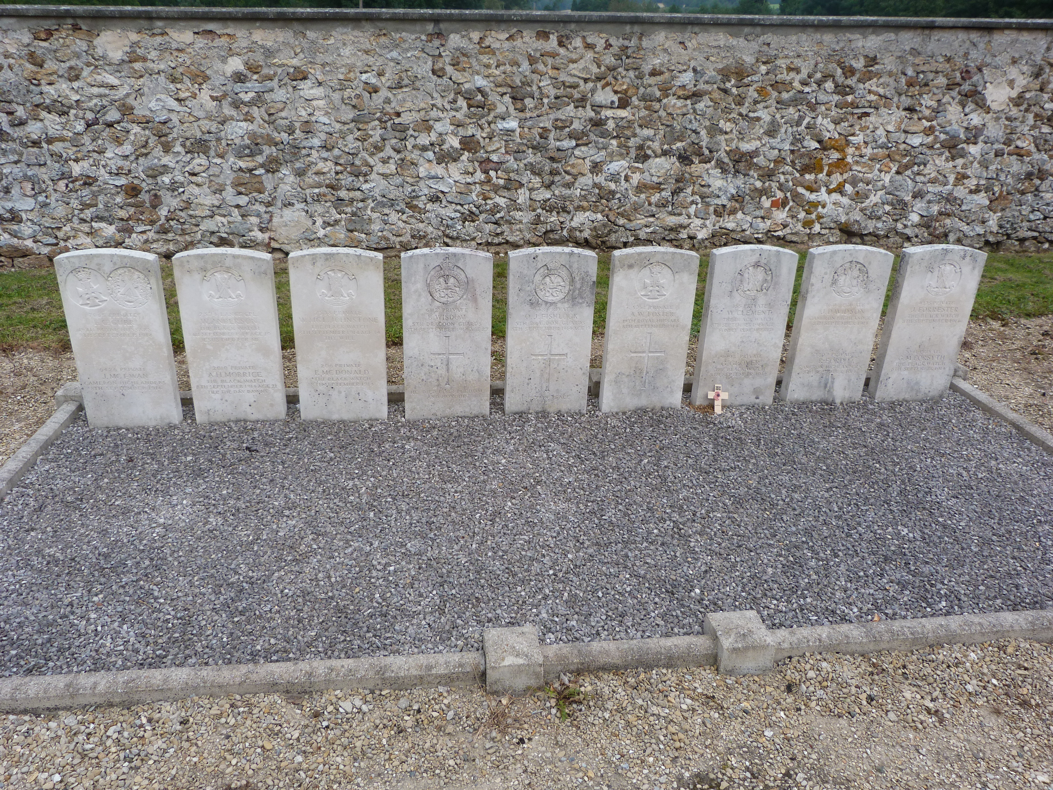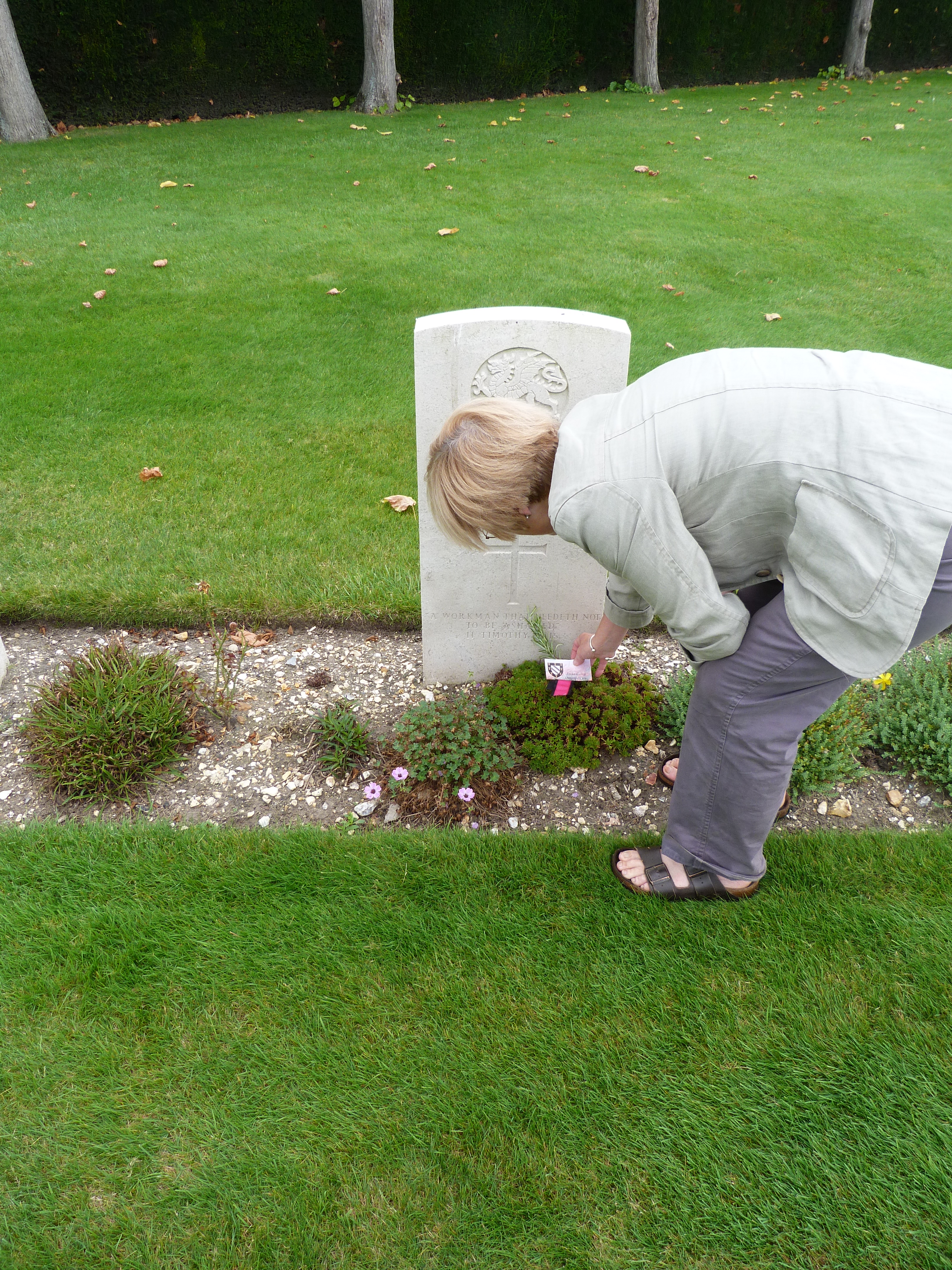 We were pleasantly surprised to find a bunch of fresh red roses on the grave of John Norwood, which is in the tiny village cemetry of Sablonniers, a village about 40 miles east of Meaux. Norwood’s biography is on the page about our 4th August activities, but it is worth noting that he is buried along with 12 soldiers [they in double graves] from the Black Watch, all of whom died on 8th September 1914. Were some of these the men he tried to rescue when he himself was shot?