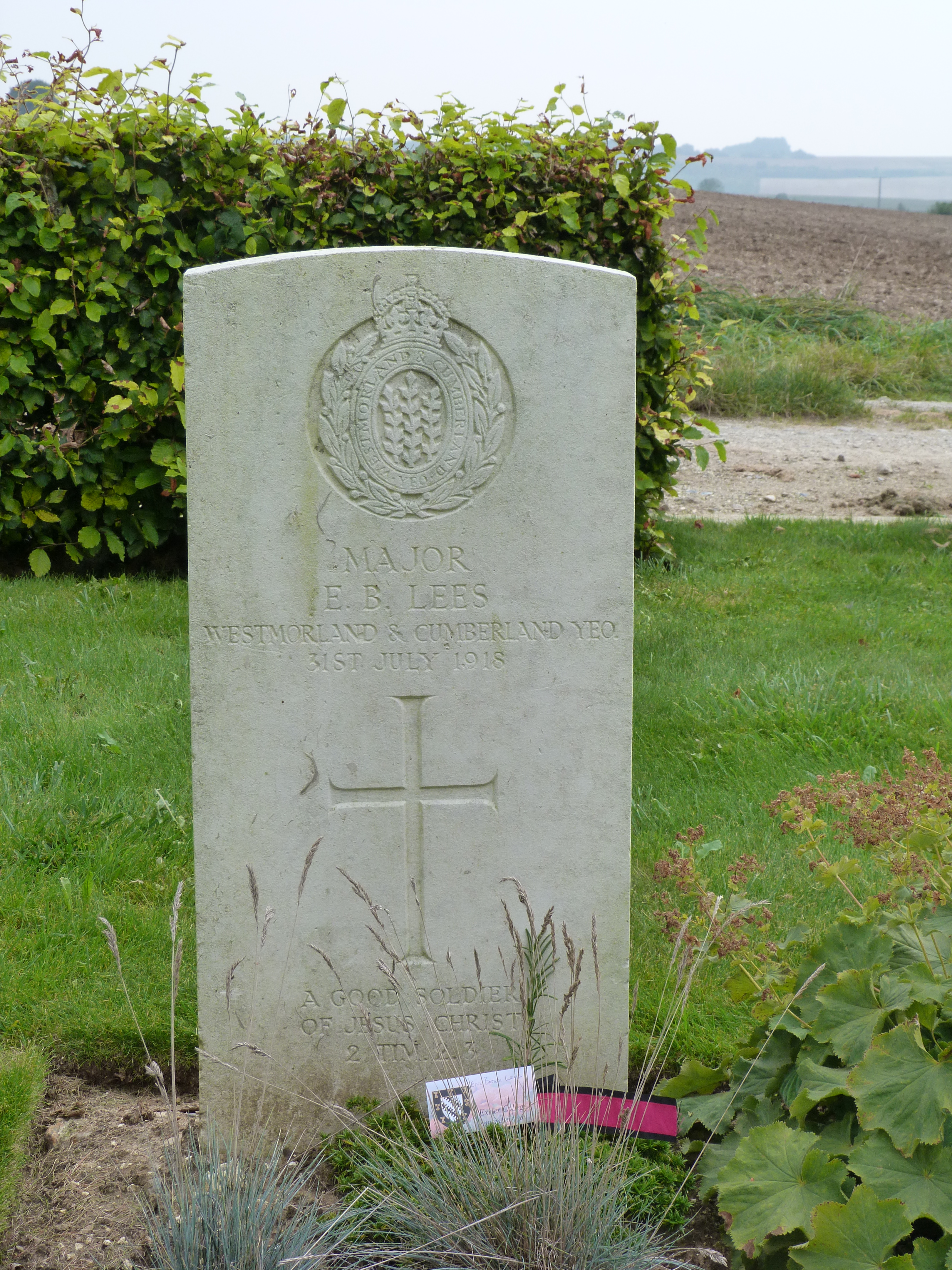 Scattered around almost every corner and on the edge of every village is a British [or French] cemetery, standing as a memory of the intensity of human life which fought and died here. We should also remember the ‘ living dead’ – those who served and survived, but who were indelibly scarred. Eric Lees is buried in one such grave yard. He was 40, and came up in 1897 from Eton. He married Florence in 1909 and lived at Thurland Castle, which was owned by his father, and is in Westmorland. He was a Justice of the Peace for Yorkshire, Lancashire, and Westmorland. He signed up on the day war broke out, and presumably, because of his age and standing in society was promoted to the rank of Major.