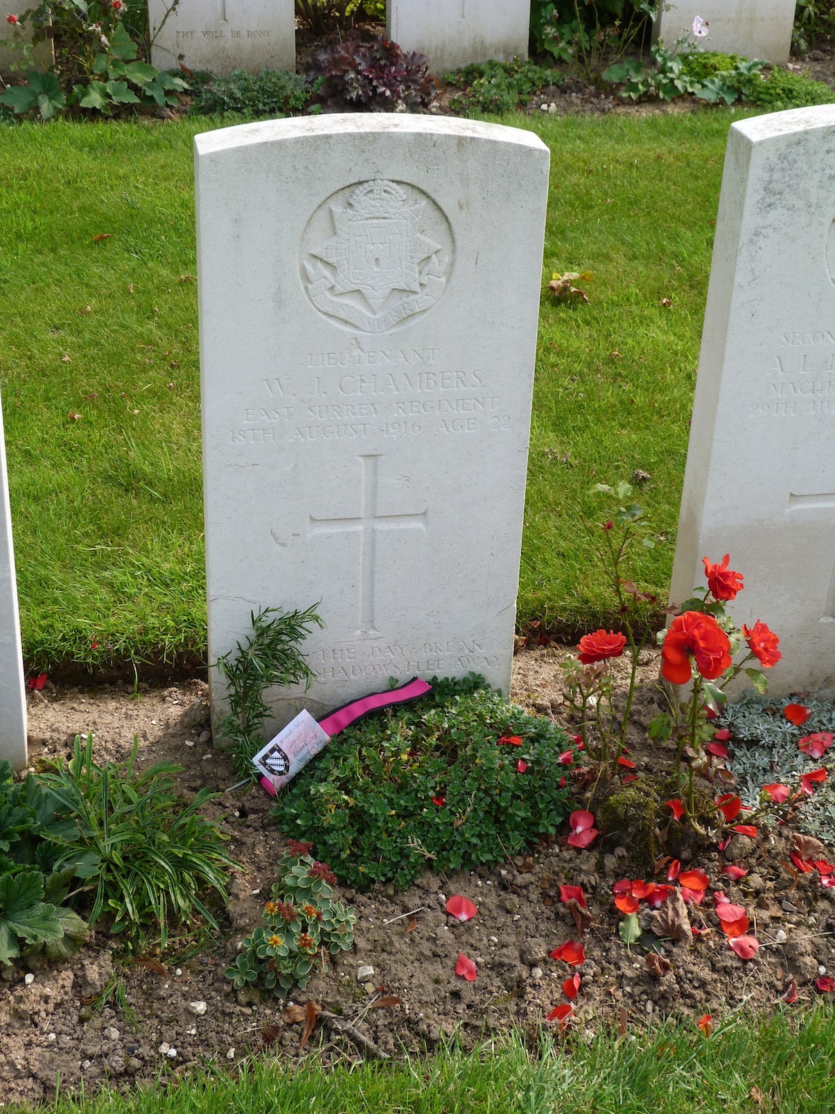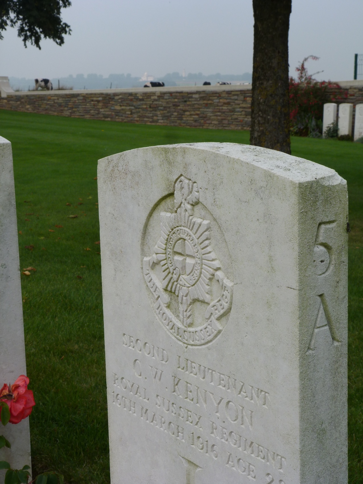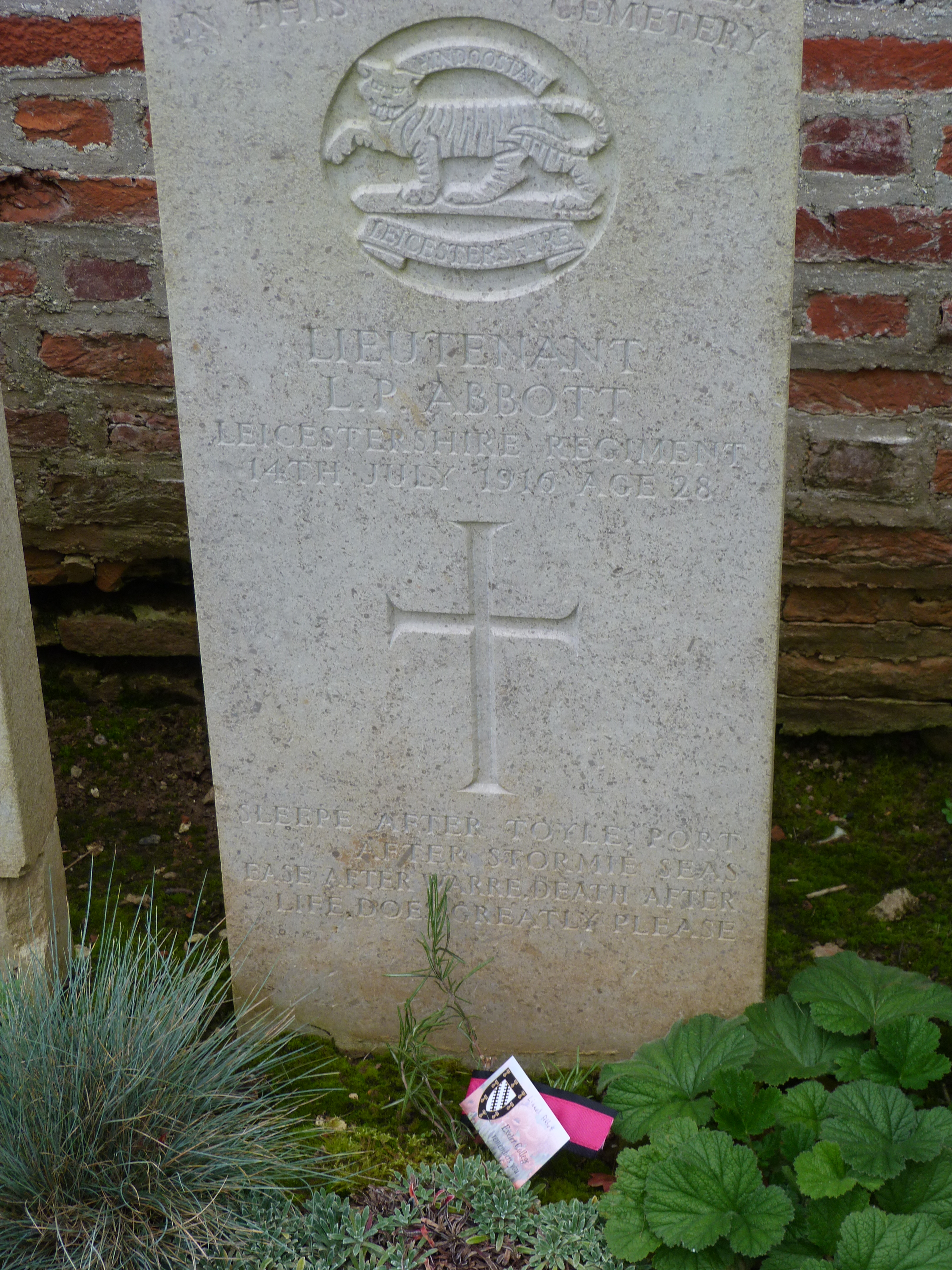 This quotation from the Faire Queene, Book 1 canto IX was chosen by Rev’d Arthur and Lucy Blanche Abbott for their 28 yr old son’s grave. Abbott was a keen sportsman, playing in the rugby XV and rowing at The King’s School, Canterbury, and was Stroke of the College boat when he came up to Exeter. He graduated in 1910 and became a school master in Leicester. In December 1914 he exchanged his teacher’s gown for the uniform of the Leicestershire Regiment. and died in November 1916. Sadly – and unfortuantely – his grave was destroyed by an enemy shell, and the headstone reads ‘believed to be buried in this cemetery.’ Flatiron Copse is in deadground, and was used as a dressing station; the shelter of the surrounding small hills affording a certain degree of protection.