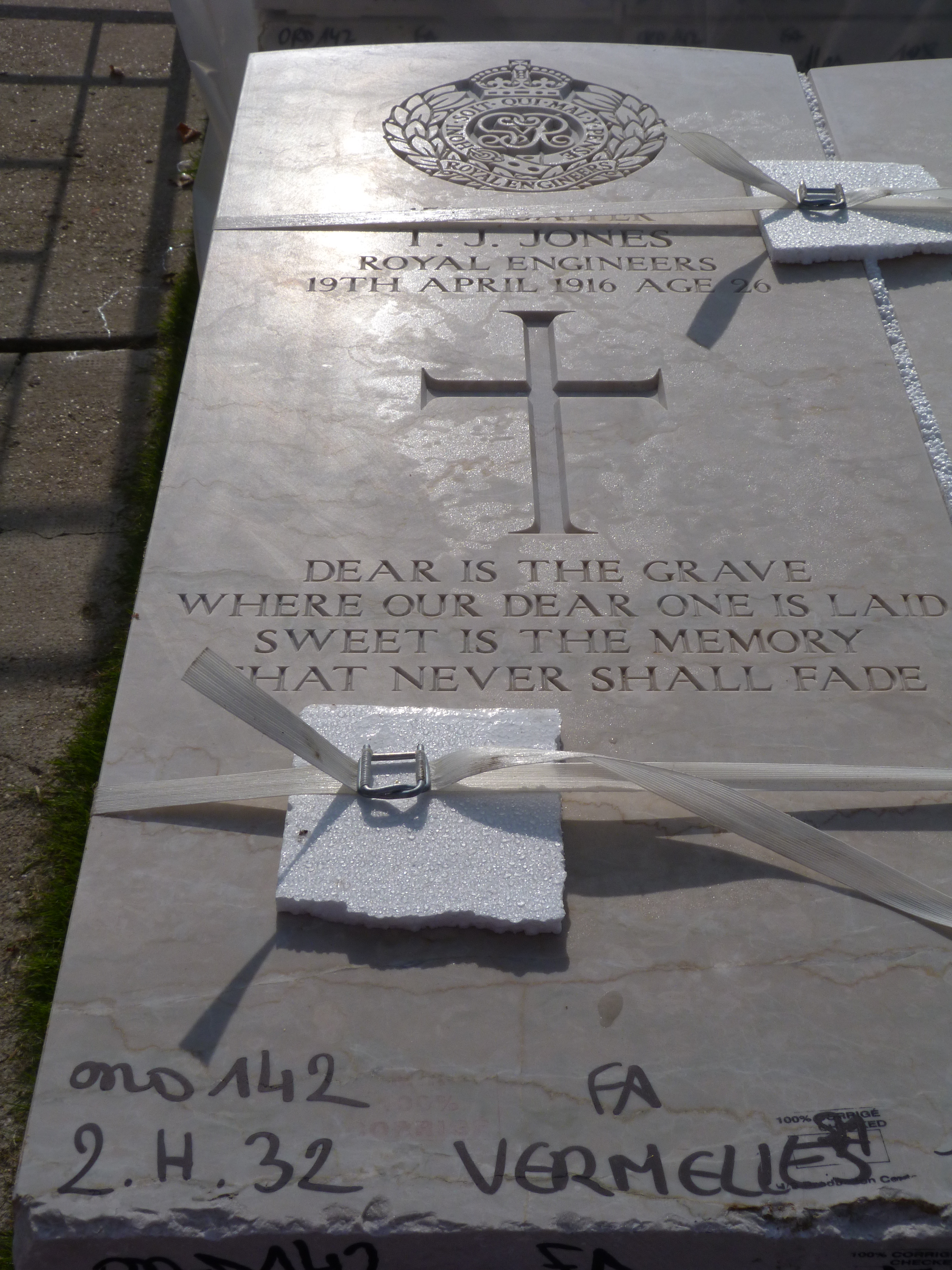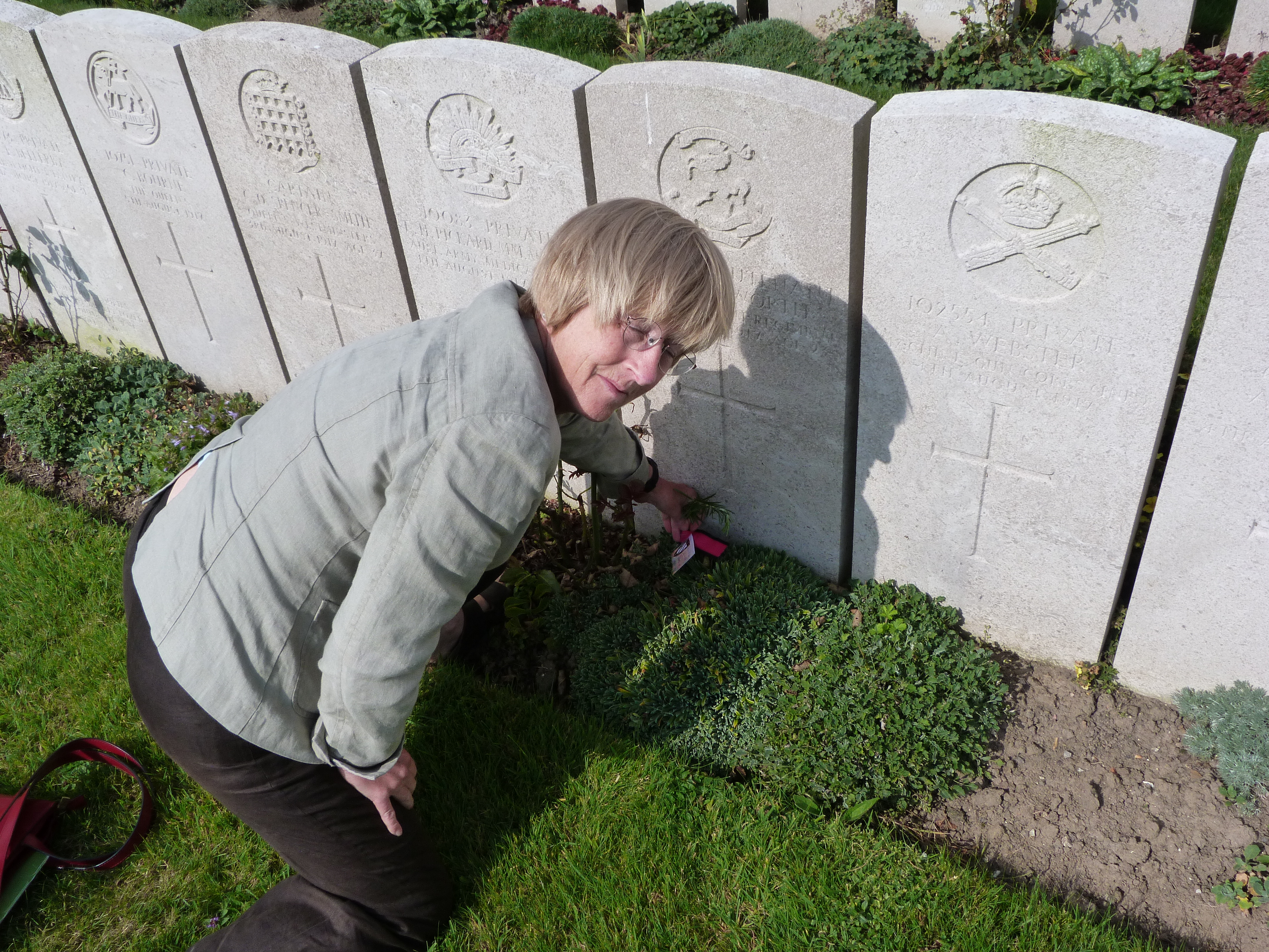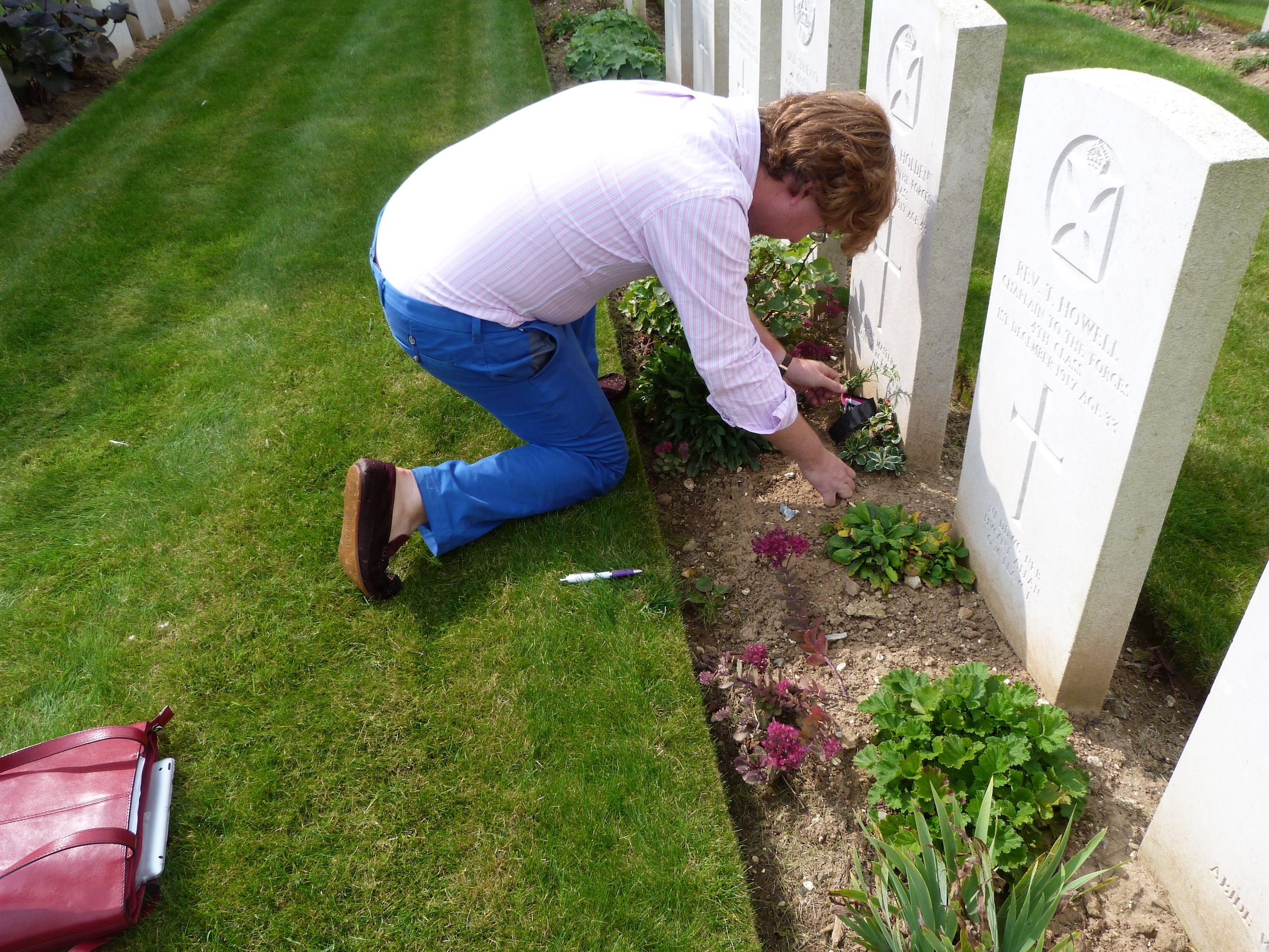 Eames came from Corby in Leicester, and on his grave is the inscription, ‘ In God’s keeping.’ The hope of eternal life is reflected too on Gibson’s grave: his carries a paraphrased inscription from John’s gospel, ‘Peace, he is not here, he is risen.’ For Christians the question of how an omnipotent God could allow such suffering is a vexed one, and for others a great stumbling block to faith. Yet the more we understand why things happen – from historical, political, economic, and probably most importantly, scientific perspectives – the concept of the almighty God becomes more difficult. I think perhaps it is time to dispense with the idea of ‘God the Father almighty’ – after all it too is a human construct, from the Council of Nicea, and instead accept and acknowledge the concept of evil in the world. With this, it is then possible to see how the loving God is able to help us through these difficulties. Certainly religious language as seen time and time again as epitaphs on these graves shows how people fell back on faith to give comfort, but ultimately it is almost impossible to answer the question, ‘why or how did God allow these young men to be killed in senseless warfare?’