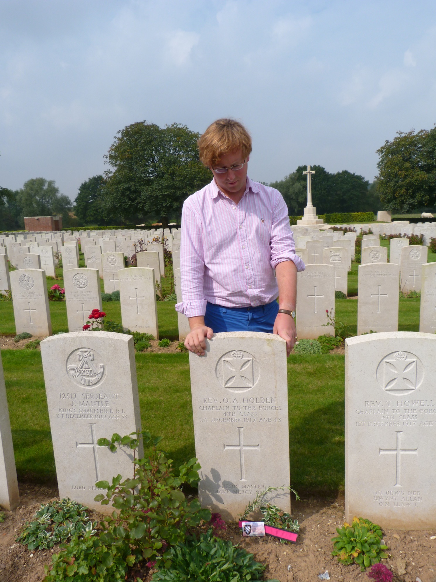 The sun shining through the early morning mist, with freshly fallen, veneer-like chestnuts resting in the dew-damp grass gives the visitor a sense of clam and peace at this cemetery. Yet Ypres was the scene of utter devastation. In this grave yard the graves are arranaged in rows and curves in relation to the huge memorial stone and cross of sacrifice, and what really brought home the sheer scale of the war is this: the long rows of graves contain exactly 92 graves, and there are probably 8 or 9 of these rows. Each year we admit between 90 and 93 undergraduatess; suddenly the white stone headstones become the faces of all the first years, then the second years, and so on. Cruddas was a second year when he signed up to fight. His father was yet another clergyman, from Cornwall who had gone to Trinity College, Oxford. Cruddas died on 21 September 1915, aged 21. Burton was older: 31 when he died. On his grave his wife, Lilian chose the words ‘Be thou faithful unto death, and I will give thee a crown of life,’ from Revelation 2. And in a funny way, these words ring true. Of course it is tragic that their lives were so short, yet, through our commemorations – not just this visit, but every time one goes into the college chapel their names appear – we do remember them, and know more about them than either those who fought in the war and survived, or many of the subsequent students who pass through the College’s medieaval gates.