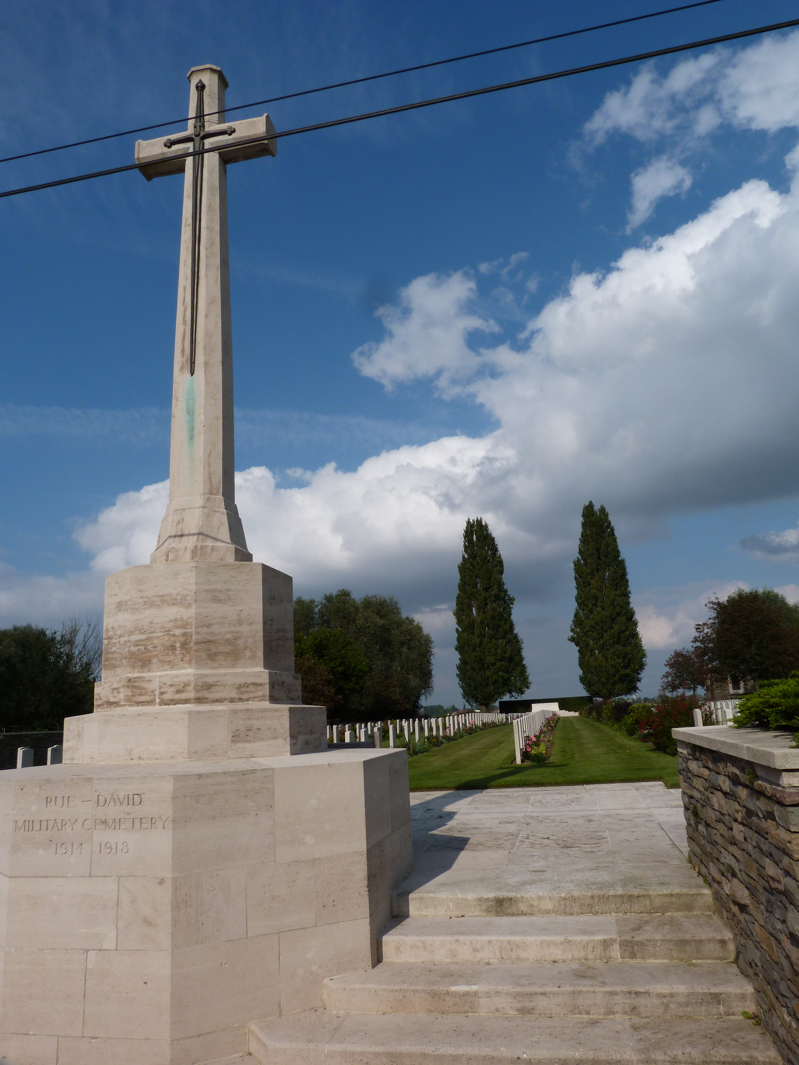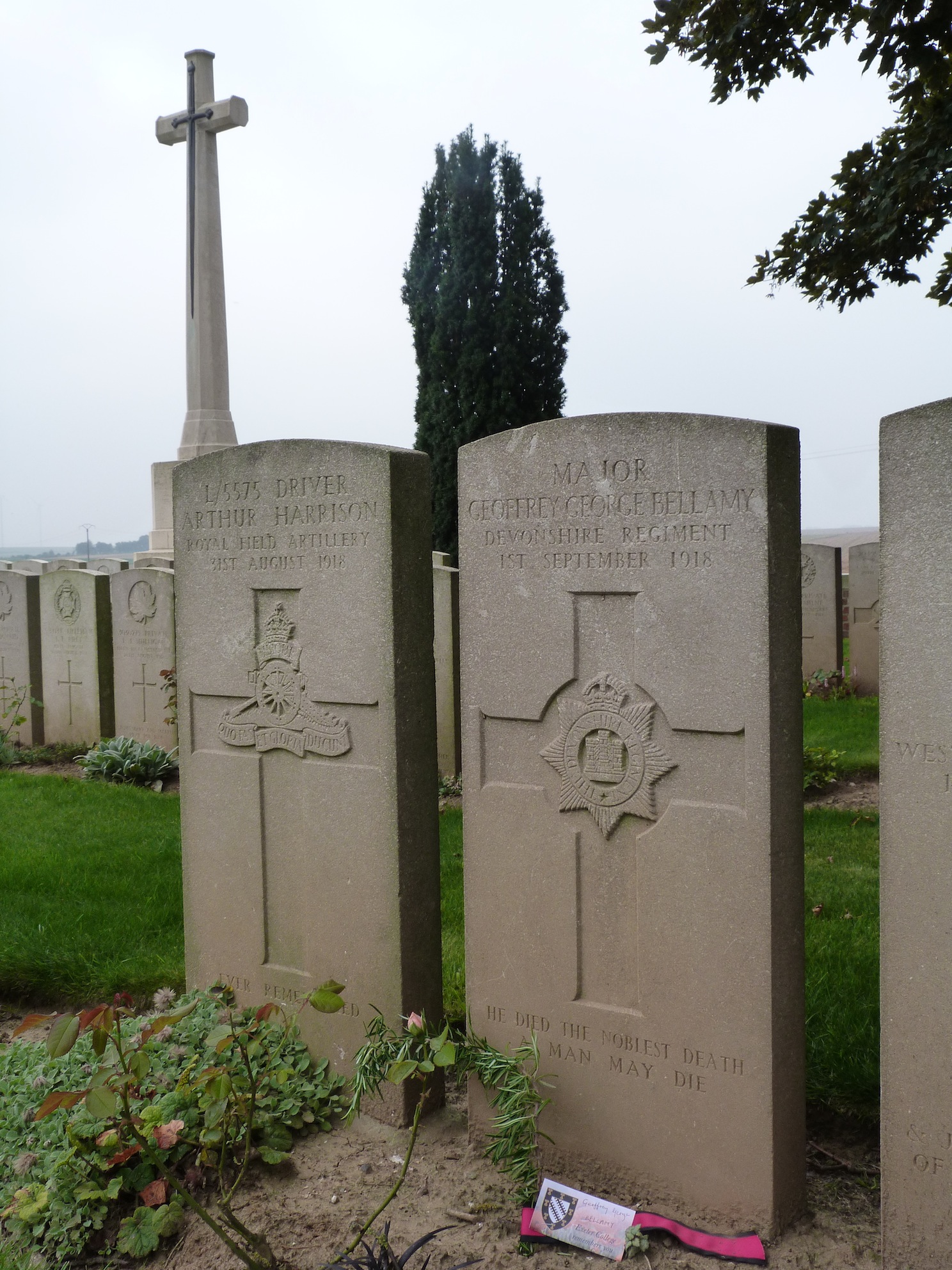 ‘He that leadeth an uncorrupt life and doeth the thing that is right’ [Psalm 15] is inscribed on the grave of Douglas Bannatyne, a Scottish lawyer who died on 1st August 1918. After the war there was much discussion about how the war dead should be commemorated, and eventually it was decided that a single design for all – privates, deserters, generals – would be used, with the name at the top, followed by the badge of their regiment / service, their names, a Cross or Star of David, and a few lines for familes to add their own inscription, which had to be approved by the Commission. It was also decided that the cemeteries should be as simple and dignified as possible. Lutyens and Blomfield [himself an Exonian] debated and discussed, and it was settled that a huge Portland stone, engraved ‘their name liveth for ever’ designed by Lutyens, and the Cross of Sacrifie [Blomfield] would be located at each burial ground. The cemetery at Raperie is a perfect example of the simplicty, peace, and dignity which so many strove to create in honour of the war dead. In this cemetery Douglas Bannatyne joins his fellow Scots as they rest in a peace they didn’t know in the last few years of their lives.