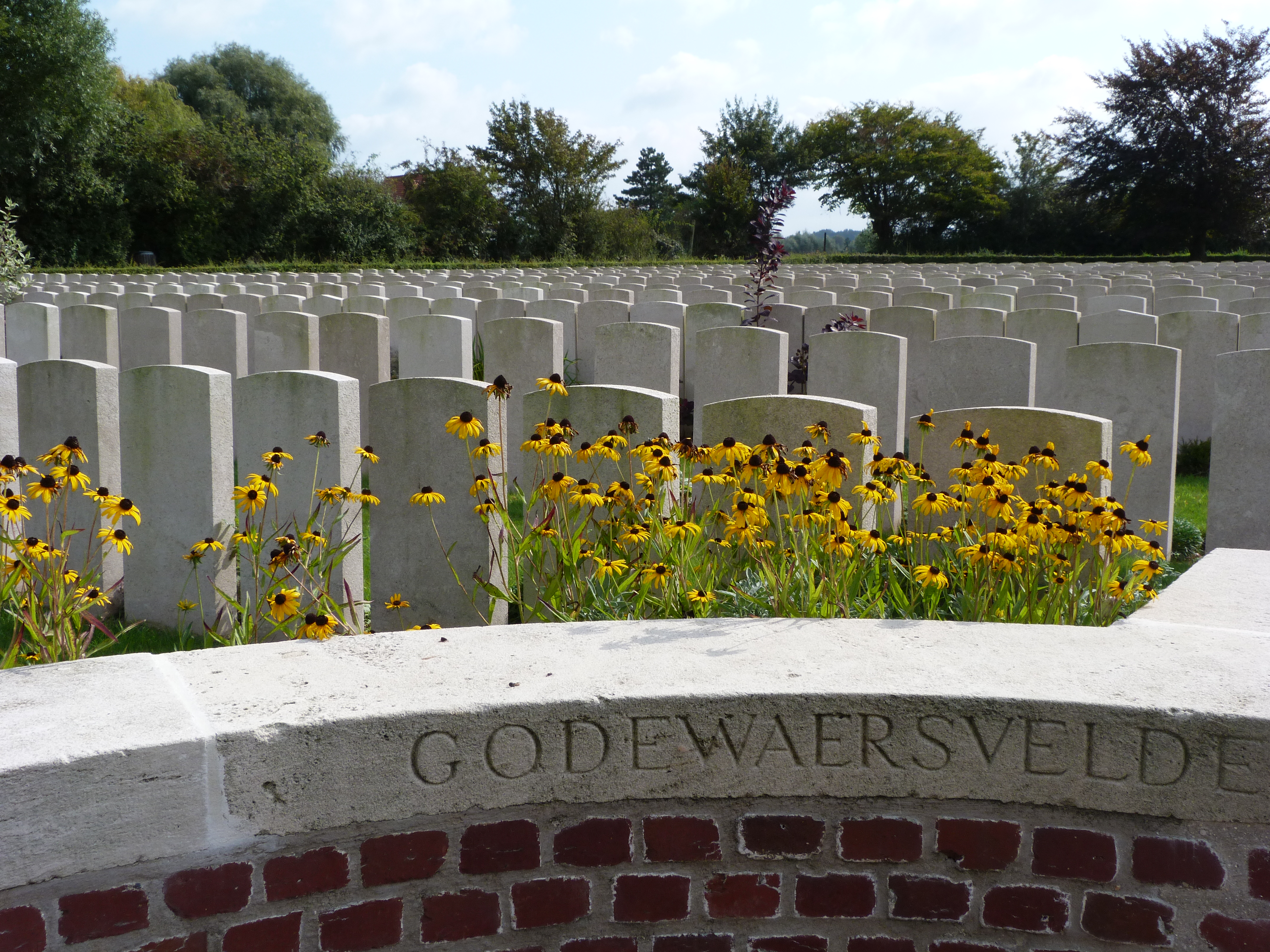 Godewarsvelde Cemetery is approached through a path full of brambles and blackberries in various stages of ripeness, reminding me of Seamus Heaney’s poem, ‘Blackberry-Picking.’ In it he describes how the buckets full of delicious, juicey blackberries which he stored up for eating later would turn to stinking juice, moudling in the barns, and it’s possible to draw some comparison with these dead young men. Almost all are aged 18 – 30, so full of potential, standing at the threshold of what would be possible. For some there could have been glittering careers, passionate relationships, grandchildren to tuck in at night; yet for others life could be a stream of disappointments and failures: imprisonments, depressions, failure. For most, life would have been a mix of each. Yet they remain like how Heaney would have wished his blackberries: to be preserved in their prime. It’s easy to see how some people found, and still find the rhetoric of the ‘glorious war dead’ difficult to process.