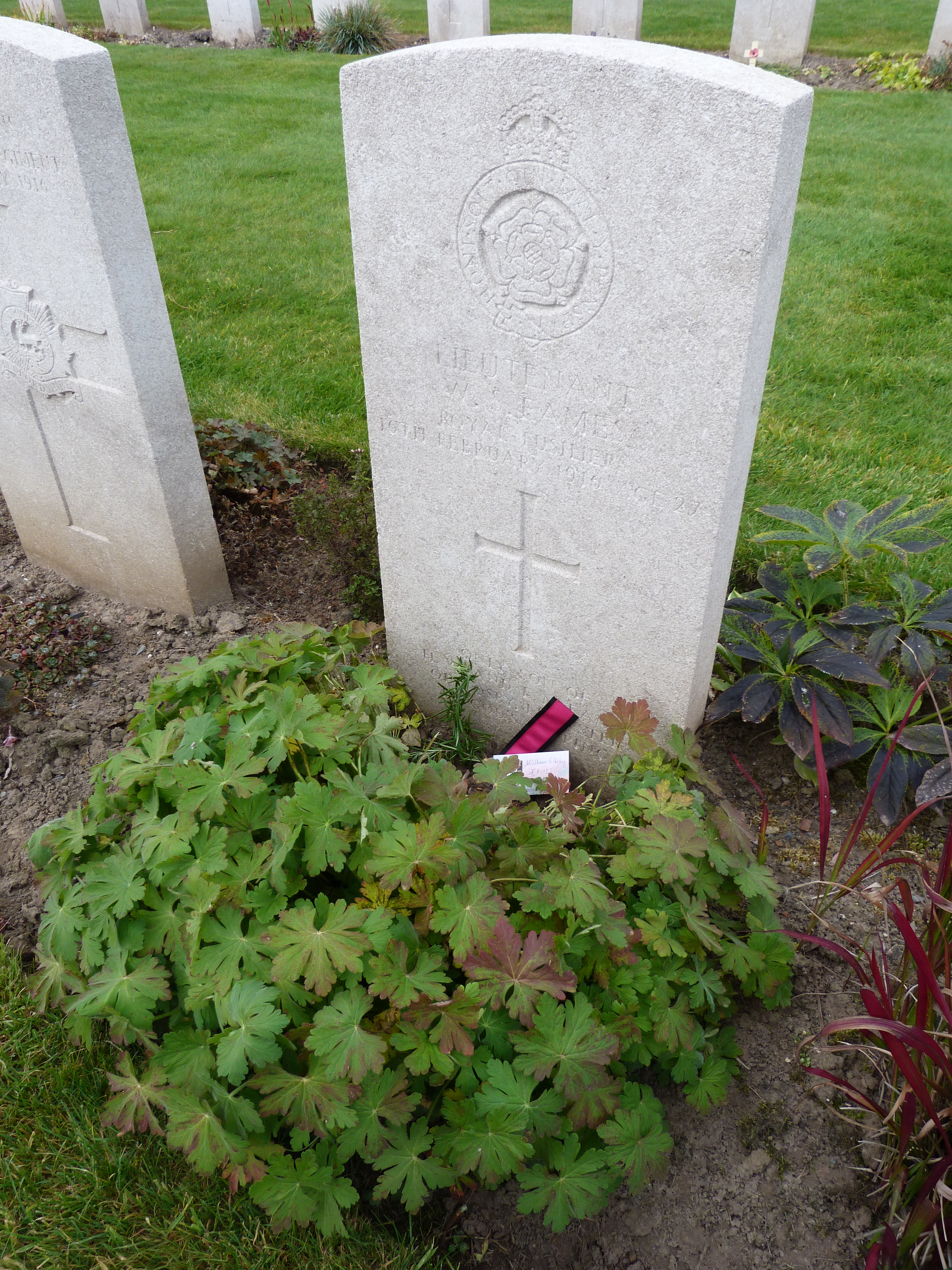 This cemetery is perfectly still apart from the gentle movement of the weeping willows and the chickens scratching about in the farmyard next door. Designed by Blomfield, it’s remarkable how the trees help to create a feeling: elsewhere stately poplars or yews line avenues, but here the carelessness of the willow blowing contrasts with the seriousness of the matter of commemorating the dead. Alec Gordon came up in 1911 and joined the army in September 1914, after he finished at the College. He was a captain the Royal Field Artillery. His pareants, John and Mary Gordon owned Potternewton House in Leeds.