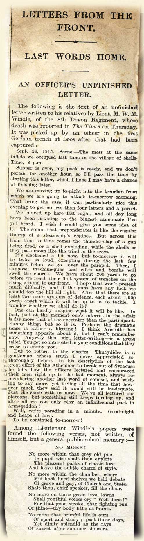 His fellow Exonian, Archibald George Roderick Smith-Sligo was a Scot from Fife, and fought in the Cameron Highlanders. His sister, Winifryde Mary Grace died on 6 November 1918. She was a mechanic / driver and is buried in the Military Cemetery in Aldershot, Hampshire.