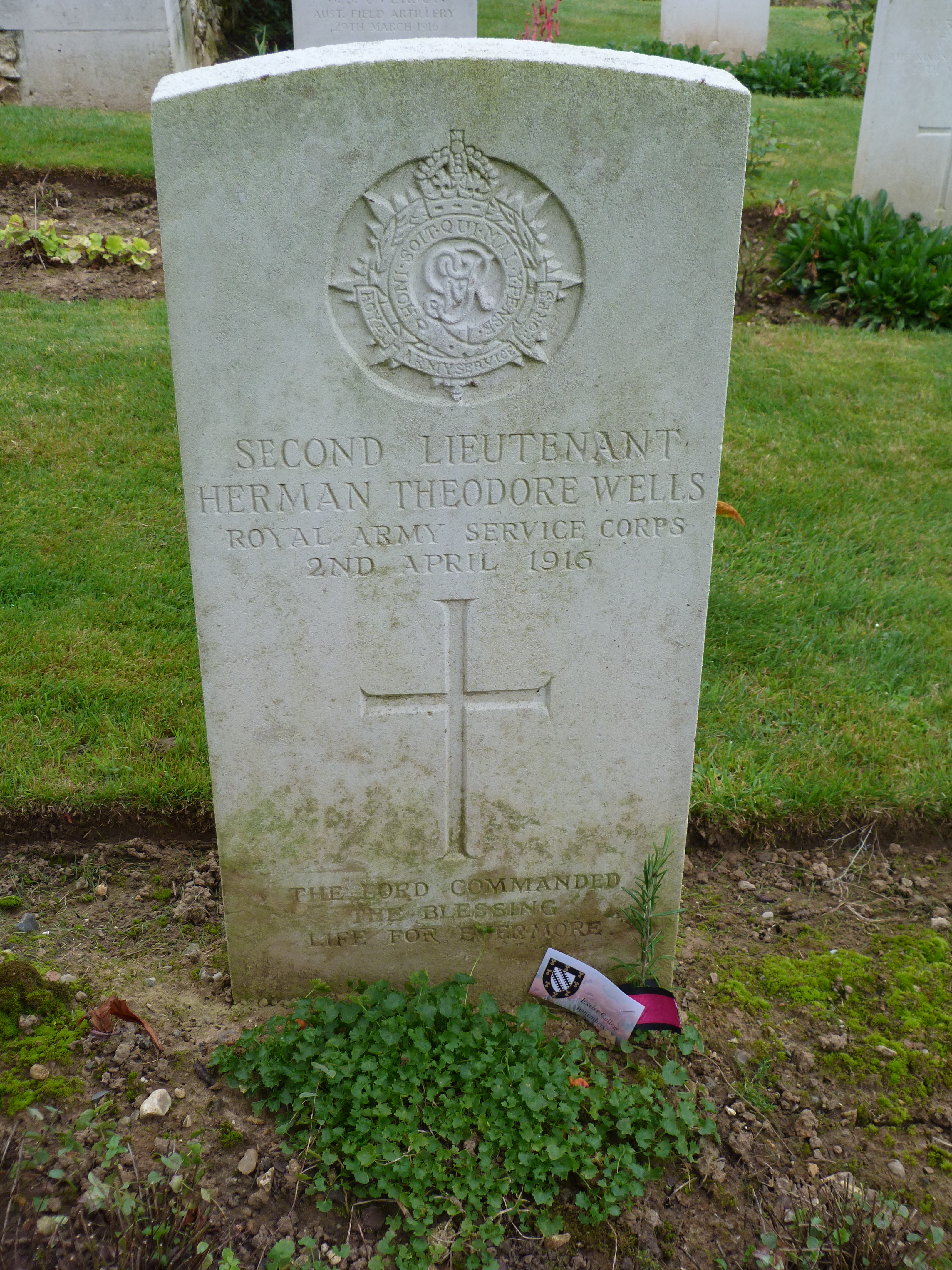 The youngest son of Rev’d Edward Wells, Rector of West Dean near Salisbury, Herman died at the age of 21 in Le Havre from pneumonia. His older brother, Edward had better fortune, and as an Army Chaplain won the MC and won the war. The inscription on his grave reads ‘ The Lord commanded the blessing – life for evermore.’ [Ps 133]. His grave, tended by the Commonwealth Graves Commission, is surrounded by flowers and well kept grass. This is in stark contrast to the civic grave yard with its grey gravel. This underlines the point made by Sir Reginald Blomfield in 1920, ” the cemeteries carefully tended, will rely for their effect on the dignity of their lay out, and the beauty of the trees, grass and the flowers.”