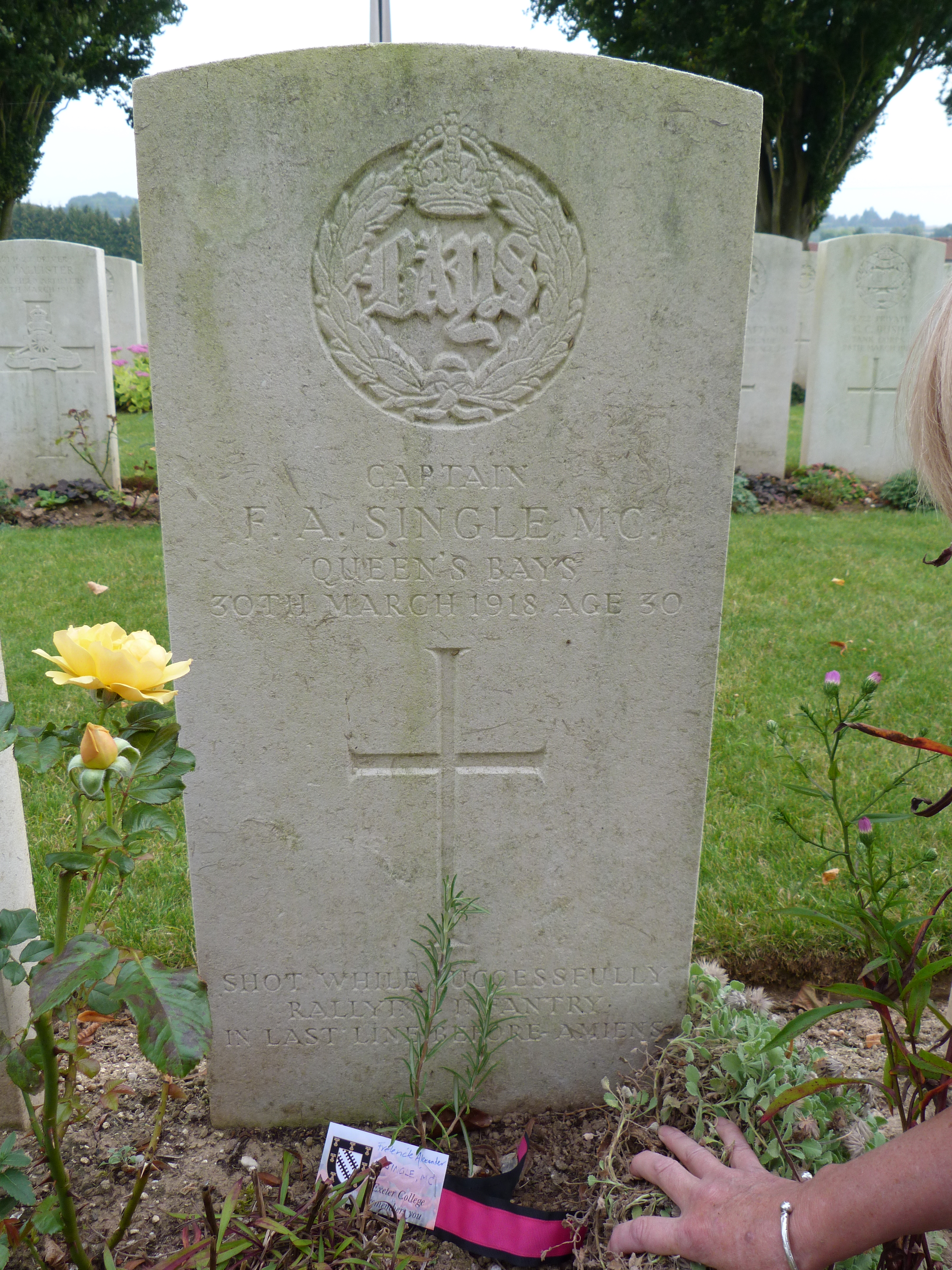Today we have visited two of Exeter’s most decorated soldiers: Green with the DSO and Single with the Military Cross. Single came up to Exeter from Winchester College, and they too have been commemorating their war dead. More information about Single can be found on their great website: http://www.winchestercollegeatwar.com/archive/frederick-alexander-single/ Namps -Au-Val lies, as its name suggests, in a valley, south west of Amiens, and is the most peaceful and beautiful location. The cemetery was designed entirely by Blomfield [many of the others were designed by several], and the good condition in which it is kept is to the great credit of the Commonwealth War Graves Commission