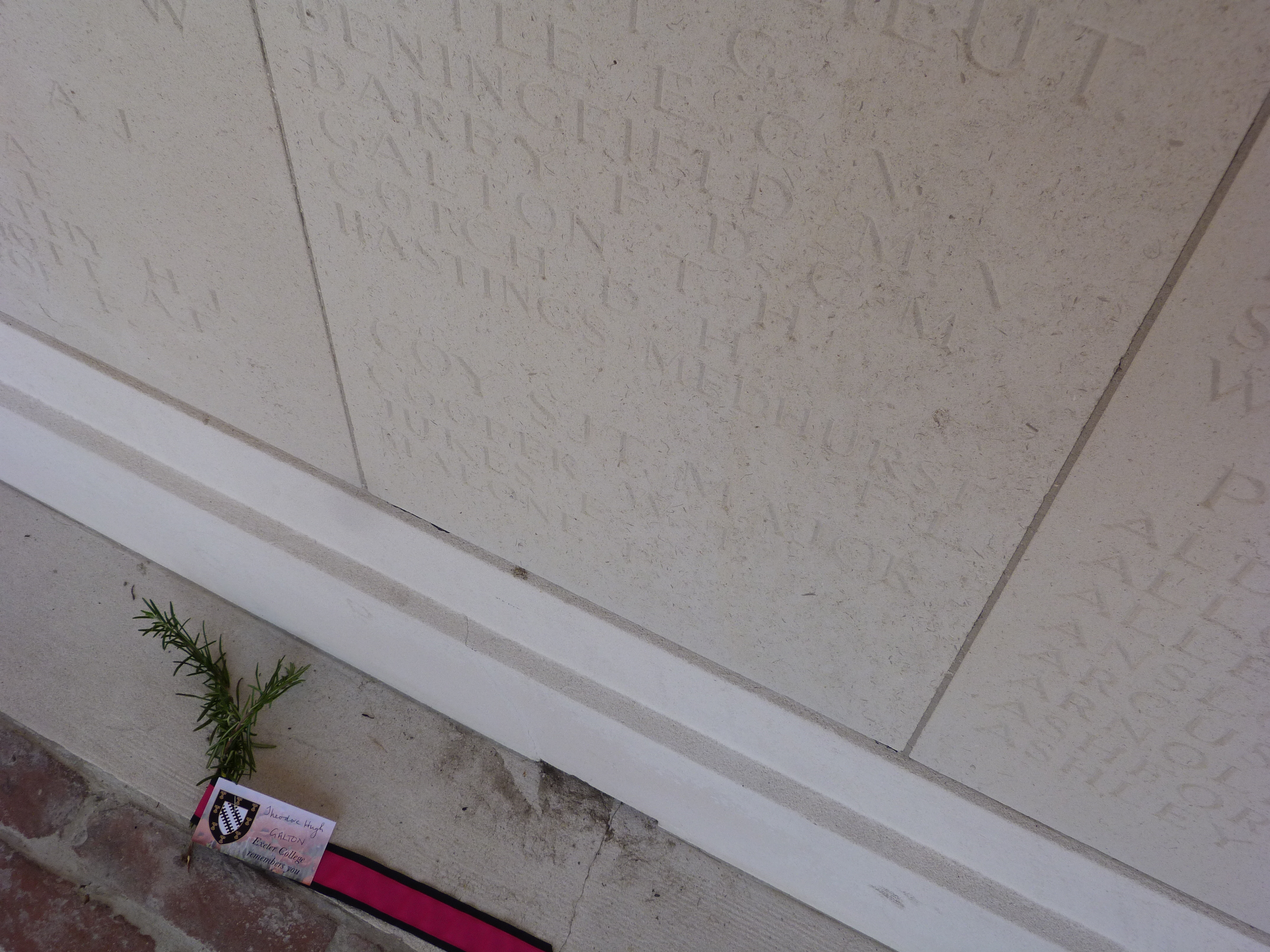 Last night many people had gathered at the Menin Gate for a simple act of remembrance; early next morning it was a very different scene. The gate is a physical gateway to the city, with cars driving throug on their way to work,and young teenagers in love having a last kiss before school. This huge monument – with many more names than just those contained within the archway – is much more than a monument; it is an inhabited space and part of the city walls and city-scape in a way that Thievpal isn’t. And the side panels extend out into a park and pond on either side. Here amongst the many thousand names are five Exonians, who all died in the first two years of the war. Rex Arnell came up in 1912 as a Scholar from the Isle of Man. His father was a flour miller, the father of three children; one of whom died in the Boer War, the other surviving the war and serving in the 1920s in Kenya. He was an avid cricketer and footballer, playing for both his old school – Berkhamstead, and the College. He was in the OTC and got his commission in 1914. He sustained injuries at the front, but returned. He was killed in ‘The Action of Hooge on 30th July 1915. This was the first time ever liquid fire flamethrowers were used in warfare.